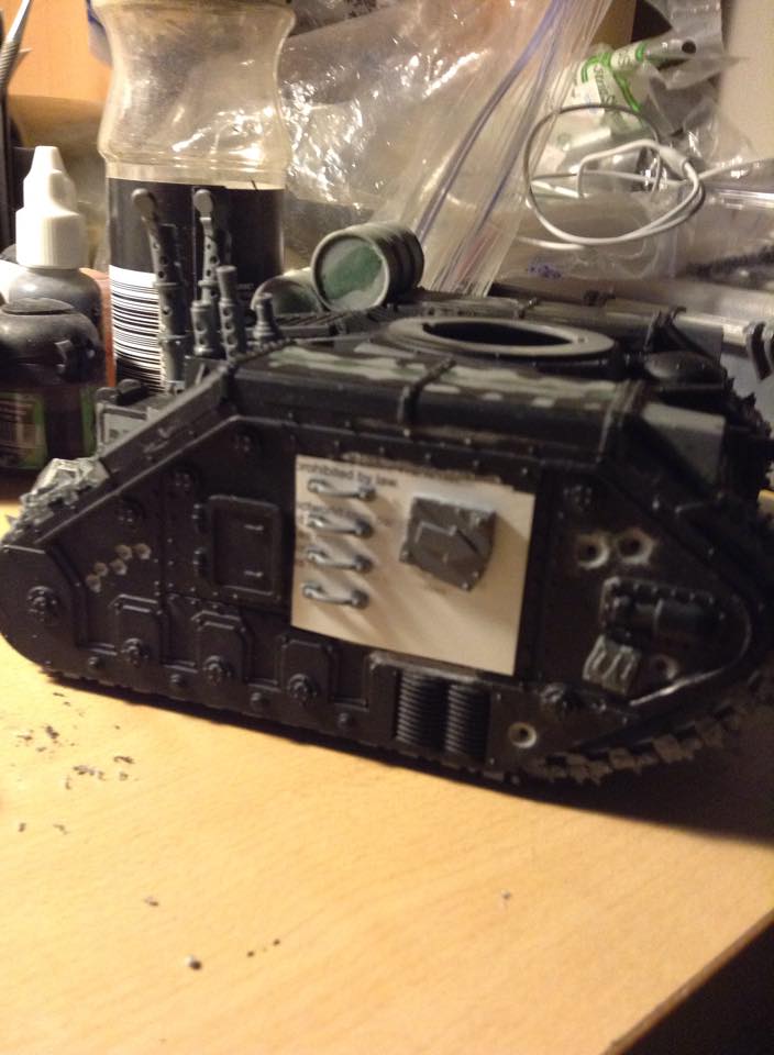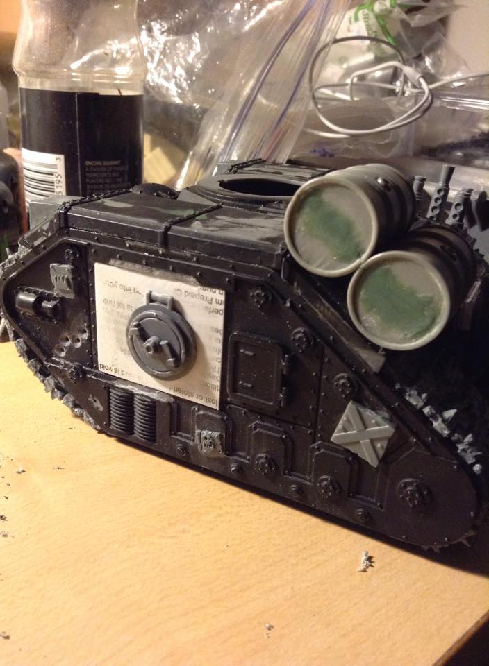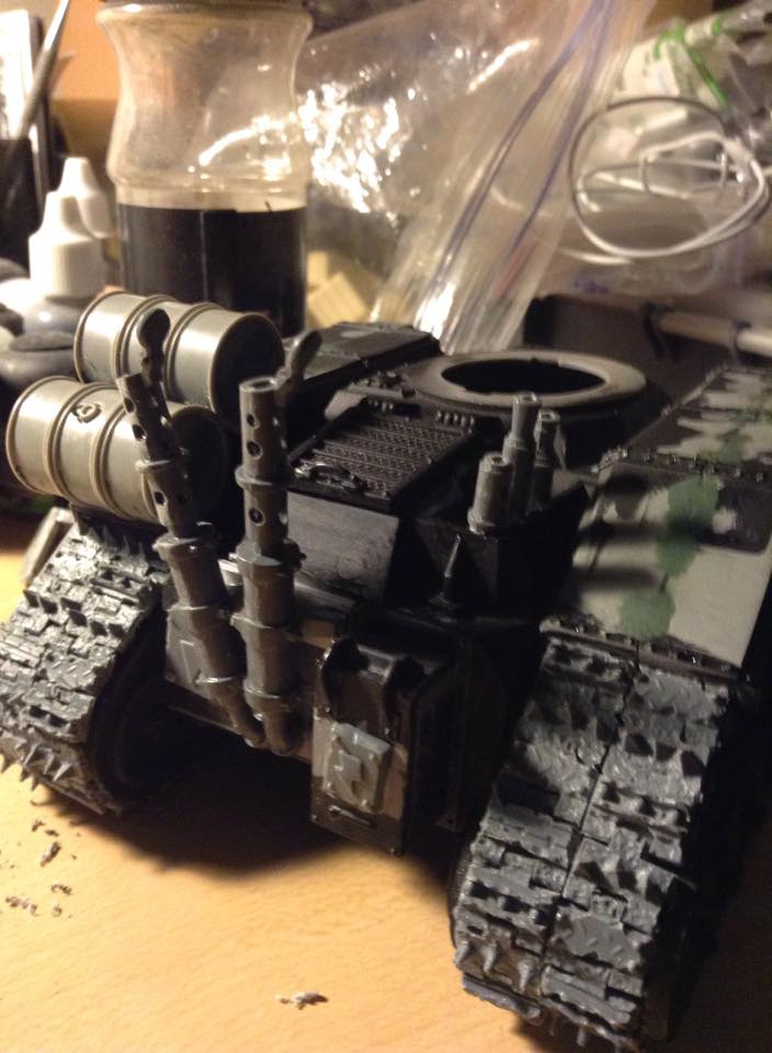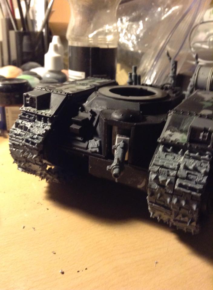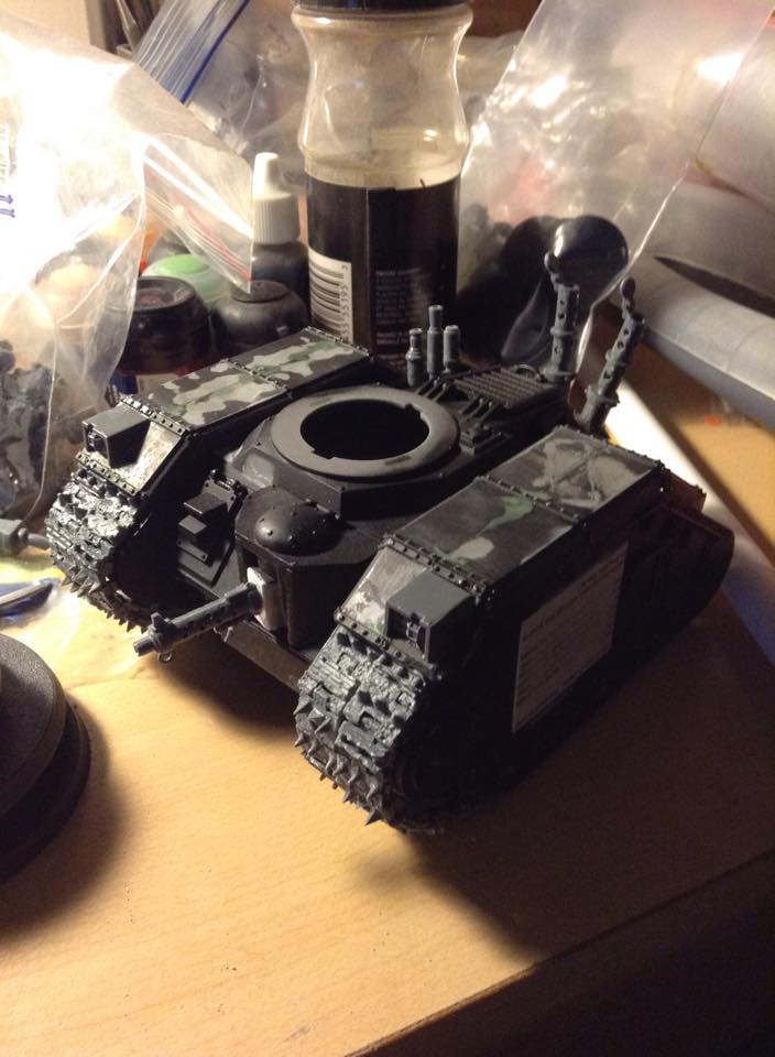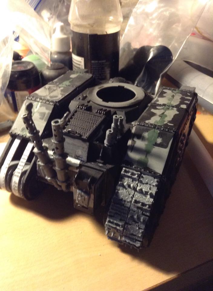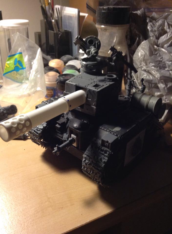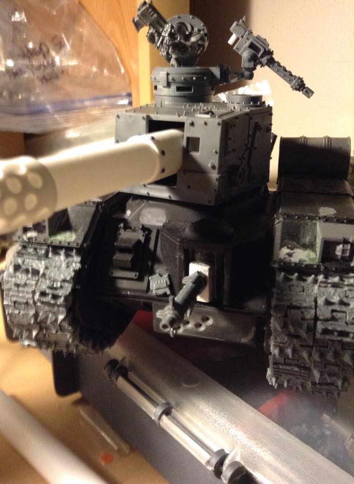Heres something I've been working on...it was a double-wide leman russ tank built when I used it...had brass casings superglued all over the thing it also had space marine predator sponsons glued into the side of the hull...that's why the plastic card is there...unfortunately I had to scrap the turret and will probably get a battlewagon turret for it, also made a custom barrel...it's still wip though...have to get the rest of the turret to really work on it, but here are the pictures