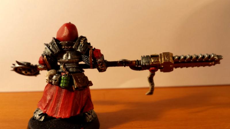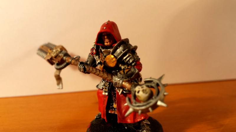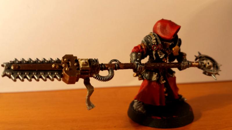Hey there folks. I'm a long time fan of Warhammer and have been out of the hobby for some time but recently got back into it thanks to a good friend of mine. I've been working on a few conversions lately with some of my old bits and newer models and came up with this fun conversion for a priest with an custom Eviscerator. The base model is an Empire War Priest with two hand weapons, whom I modified to hold the staff in two hands. The Eviscerator itself is basically Sentinel close combat weapon placed atop a Nemesis Warding Staff and the staff's normal head placed at the bottom as a sort of pommel. I used a hooded head from a Dark Angel's Deathwing Terminator as his head a there we have it. I'd love some input on not only the model itself but the paint job (it's mostly done save for a few minor touch ups here and there. I put him together to represent a unique Priest character with special rules that I plan to present to my home game but wanted to see what everyone thought.