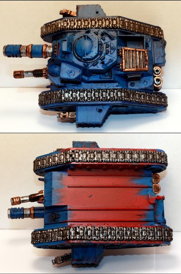 Next, a coat of Asurmen Blue wash applied in the same, streaky manner. I put it heavily on the top of the tank and made sure to cause it to pool -but not too heavily- in certain places (like the stowage bin on top), so that it gave the appearance of sloppily and thickly applied paint. It also pulled the two colors of blue together to make it look like one coat of blue that was applied more heavily in some areas than others, rather than two colors atop each other.