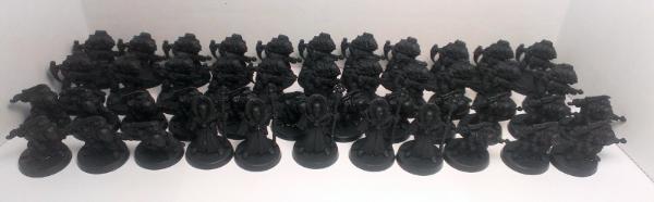 I took the 2 Hybrid poses that have their arms sculpted in and the Magi sculpts, filed the mold lines, and based them. I spray primed them all black and Wham! Ready for paint.