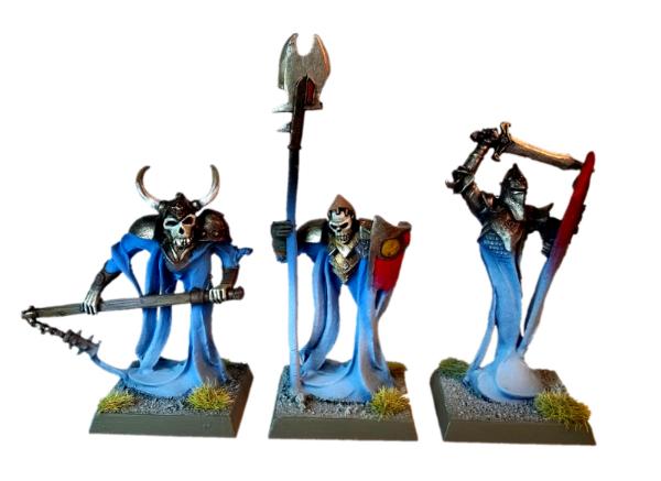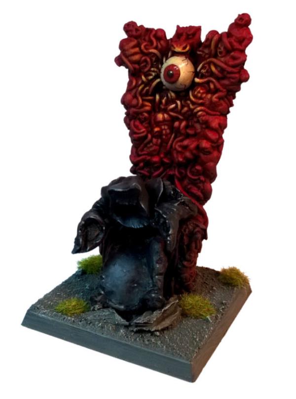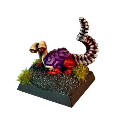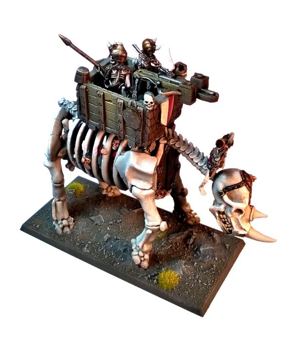 I love this mini. It's utterly bonkers, yet strangely logical that skeletons would use the ribcage of their undead war rhino to contain their mortal prisoners - who seem to have been painted to represent a very typical low-level adventuring band, deprived of both weapons and armour - which has then been used to decorate the outside of the Rhino! Genius. It's a Marauder classic, almost impossible to find intact these days (and this one isn't either: the skeletons that came with it aren't the original crew, other than the Mahut, and the tail is missing from the kit), and the casting was atrocious by modern standards. Still, it scrubs up well and I really enjoyed working on it. Thank heaven for airbrushes, though.