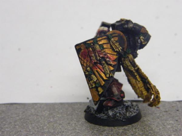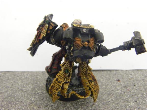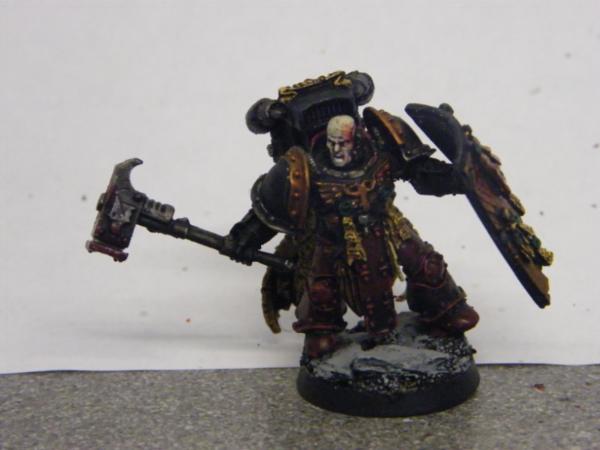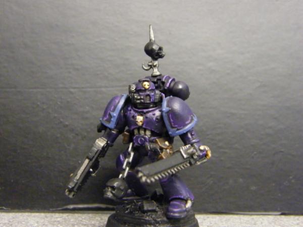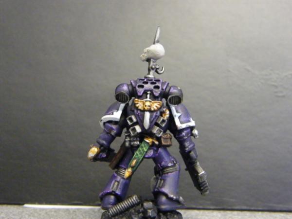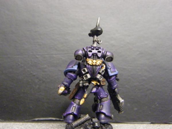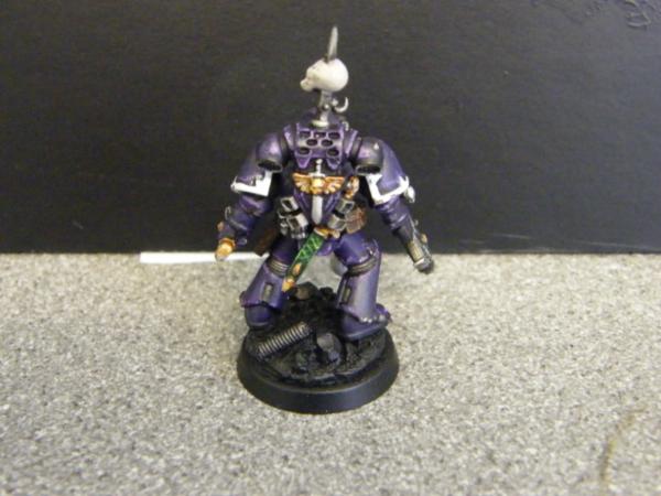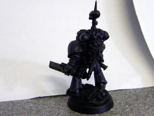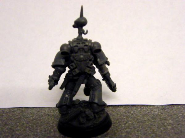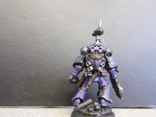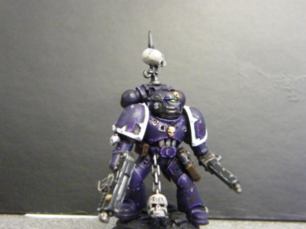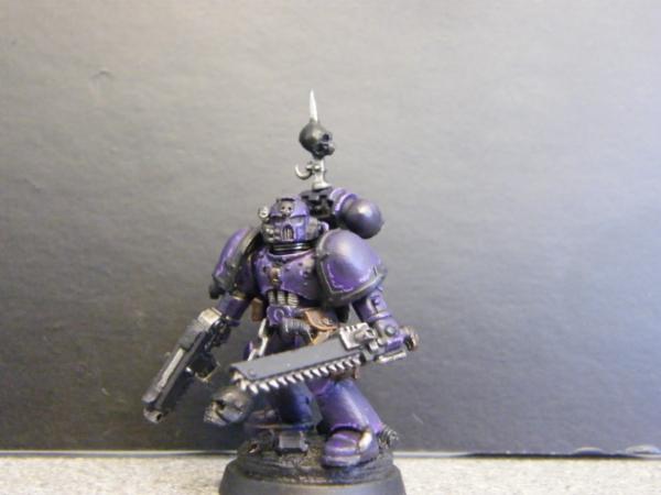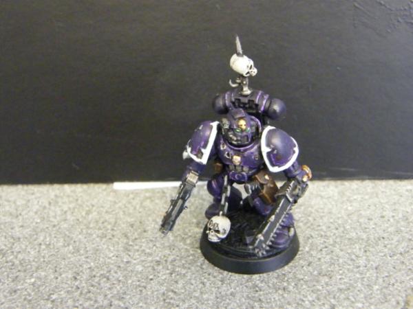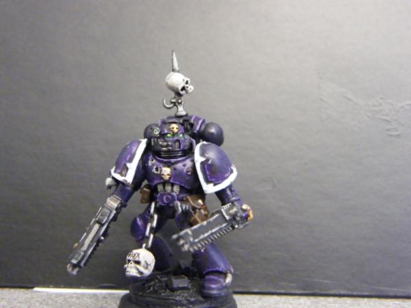 The Herald, as he has become known is something of a diplomatic envoy and advisor, sent to aid the Karthasians by the Renegade chapter of the Extinction Angels following their recent split from the Imperium. In practical terms, he is the strength of this warband, a juggernaut capable of soaking most and dishing it out in return, but that is all. In political terms he is an envoy for the Extinction Angels. There are odd times when the Karthasians will broach an imperial envoy or approach an imperial faction and during these the Herald remains silent. Fortunately his armour is not as corrupted and lost as those of his brothers, for where several chose to embrace the fell powers the 3rd company did not, their armour patterns only changing due to necessity and survival.