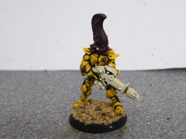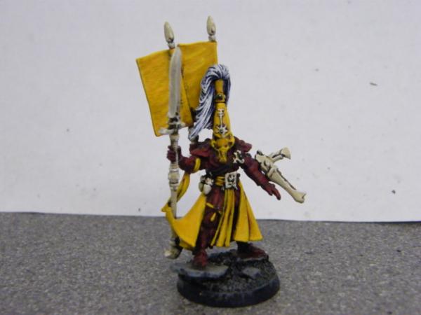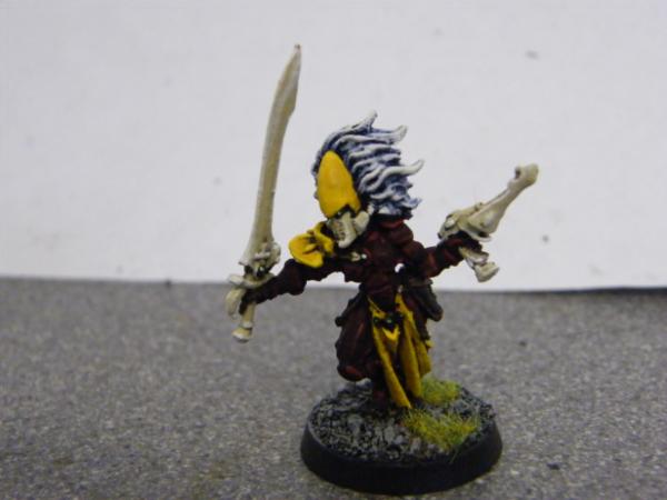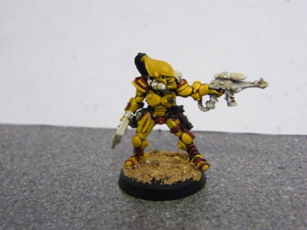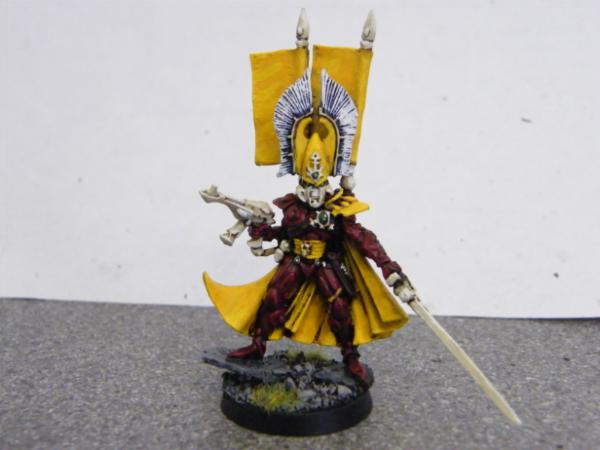 The newer painted Autarch - Banshee Mask and Firesabre. He's very much a staple of the colour scheme - bone weapons, piping, grenades etc. Yellow and Red as the main colours and the 'hair' in the white...