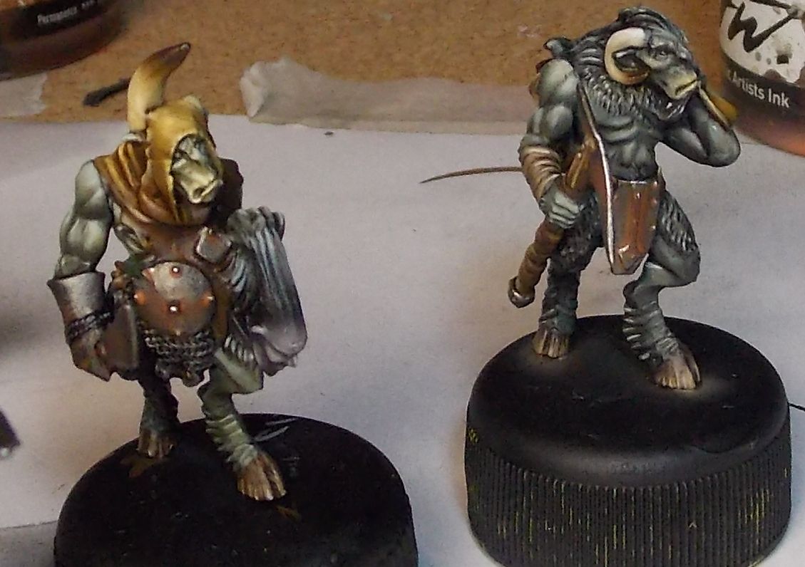 Fantastic job. I love beastmen, and yours are some of the best I've seen. As for the horns, plenty of animals in the real world have horns darker at the tips, most notably longhorns as well as most African antelope species. Too many miniature painters I've noticed base what they believe to be fact to be simply what they've seen on other miniatures instead of looking at the real world. Besides, this is fantasy and the contrast of the horns being lighter near the head works much much better from an artistic standpoint so don't bother changing a thing your warband is pure awesomeness. I will endeavor to get my blends as smooth as yours!!