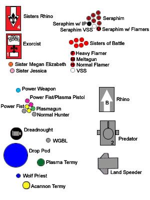 Sister Jessica?s finger slammed down on the communicator button, her eyes flashing hotly. ?For the last time,? she spat, ?This is an active installation of the Ecclesiarchy. No training maneuvers have been authorized and none shall take place! You are ordered to turn that Thunderhawk around and return to your Battle Barge at once!? The Wolf Guard Battle Leader?s face on the monitor pulled into a tight grin. ?Listen, darlin?,? he growled. ?I?m on orders to retrieve that statue, and that statue is comin? with me. We?re trainin? here, and it?d be best if you stayed out of the way.? Sister Jessica fumed. Violently, she stabbed her finger down on the button, but a hand closed over her wrist and gently pulled it away. Sister Megan Elizabeth frowned at the Wolf Guard Battle Leader. ?There is no reasoning with these fools,? she said quietly and calmly. ?They?re little more than animals, and only the Emperor knows why their blasphemy is tolerated. But I have little patience for the savages. Prepare the Sisters to defend the shrine. If the brutes make landfall, destroy them all as traitors in the name of the Ordo Hereticus. Purge the heretics from this hallowed ground.? ************************************** The Interactive Battle Report is a regular feature of TWF, and the first installment here proved that it could work just as well on Dakka. A little background on the Interactive Battle Report, for those who don't visit TWF: Originally, a TWFer named jonpegg came up with the idea of posting a battle report in segments, only posting a turn at a time and letting people discuss the game in progress in between turns. The result is usually some great discussion over what is happening in the battle, tactica, where things are going right or wrong, etc. The first 40k Interactive Battle Report featured Eldar vs. Kroot Mercenaries, and there was some feedback that the armies were a little too obscure for people to properly participate. In the interest of recognizing reader preferences, this battle features two more ?mainstream? armies. This mission was randomly generated as OMEGA LEVEL TAKE AND HOLD. Jessica Dejong, a regular on TWF, agreed to command his normal tournament Space Wolf forces. For my part, I am in the baby stages of pulling together a full Sisters of Battle army, and had a list I wanted to try out. We took turns placing terrain. The Sisters of Battle military installment is centered by the objective, a statue of St. Milano of Astrix V, housed in a level 2 shrine that provided 5+ cover saves to anyone in it, but counted as open terrain. The upper left of the field was the ?entrance? to the enclave, protected by a level 1 fortified wall that provided a 4+ cover save for infantry and was impassable to vehicles. A level 2 defensive emplacement served as area terrain in the center left of the field and provided a 5+ cover save, while the lower left was dominated by a level 2 pile of 5+ cover save rocks and the chapel of St. Milano (a 4+ cover save, level 3 building). A level 2 ammo dump provided a 6+ cover save in the lower center of the field. The right side of the field was covered by the military complex of the Sisters of Battle. A level 3 Manufactorium provided a 4+ cover save to the lower right, as did the level 3 Rhino wreckage. The level 3 Sanctorium stretched lengthwise across the upper right corner, while we decided that the level 3 Bastion and the level 2 water tanks in the upper right corner would be impassable terrain. The Space Wolf army looked like this: HQ: Venerable dread - Assault cannon, smokes, extra armour - 163 Wolf Guard battle leader - Bolt pistol, frost blade, frags, wolf pelt - 85 Wolf priest - Plasma pistol, power weapon, wolf pelt, healing potions and balms, frags - 134 ELITE: 5 Wolf Guard bodyguard - 1 Powerfist, plasma pistol, & wolf pelt 2 Terminator armour, assault cannon & runic charm 2 Terminator armour, bolter/plasma & runic charm Assigned to the wolf priest- 253 Mounted in a drop pod - 30 TROOPS: 8 Hunters - 3 Bolter & cc weapon, 2 fist & bolt pistol, 2 plasma pistol & cc weapon, 1 plasmagun - 201 Mounted in a rhino - smokes, extra armour, dozer - 63 8 Hunters - 3 Bolter & cc weapon, 2 fist & bolt pistol, 2 plasma pistol & cc weapon, 1 plasmagun - 201 Mounted in a rhino - smokes, extra armour, dozer - 63 7 Hunters - 3 Bolter & cc weapon, 1 fist & bolt pistol, 1 plasma pistol & power weapon, 1 plasma pistol, 1 plasmagun - 179 Mounted in a drop pod - 30 FAST ATTACK: Land Speeder Tornado - 80 Land Speeder Tornado - 80 HEAVY SUPPORT: Pred - Twin las, heavy bolter sponsons, smokes, extra armour, dozer - 143 Pred - Twin las, heavy bolter sponsons, smokes, extra armour, dozer - 143 1848 points The Order of the Blazing Heart looked like this: HQ: Sister Megan Elizabeth - 131 Cannoness: Inferno Pistol, Blessed Weapon, Cloak of St. Aspira, Frag Grenades, Jump Pack Sister Jessica - 112 Cannoness: Bolt Pistol, Eviscerator, Cloak of St. Aspira, Frag Grenades, Jump Pack TROOPS: The Arm of the Emperor - 234 9 Battle Sisters, Heavy Flamer, Meltagun Veteran Sister Superior Monica - Eviscerator, Book of St. Lucius Rhino w/ Extra Armor and Smoke The Iron Fist - 234 9 Battle Sisters, Heavy Flamer, Meltagun Veteran Sister Superior Stacey - Eviscerator, Book of St. Lucius Rhino w/ Extra Armor and Smoke The Cleansing Fire - 200 9 Battle Sisters, Heavy Flamer, Flamer Veteran Sister Superior Stephanie - Bolter Rhino w/ Extra Armor and Smoke The Purging of Heresy - 202 9 Battle Sisters, Meltagun, Meltagun Veteran Sister Superior Stephanie - Bolter Rhino w/ Extra Armor and Smoke FAST ATTACK: Holy Vengeance - 233 7 Seraphim, 1xHand Flamers, 1xInferno Pistols, Frag and Krak Grenades Veteran Sister Superior Leasa - Eviscerator, Frag and Krak Grenades Righteous Anger - 233 7 Seraphim, 1xHand Flamers, 1xInferno Pistols, Frag and Krak Grenades Veteran Sister Superior Deidra - Eviscerator, Frag and Krak Grenades HEAVY SUPPORT: Burning Rain - 135 Exorcist Emperor's Wrath - 135 Exorcist Total: 1
