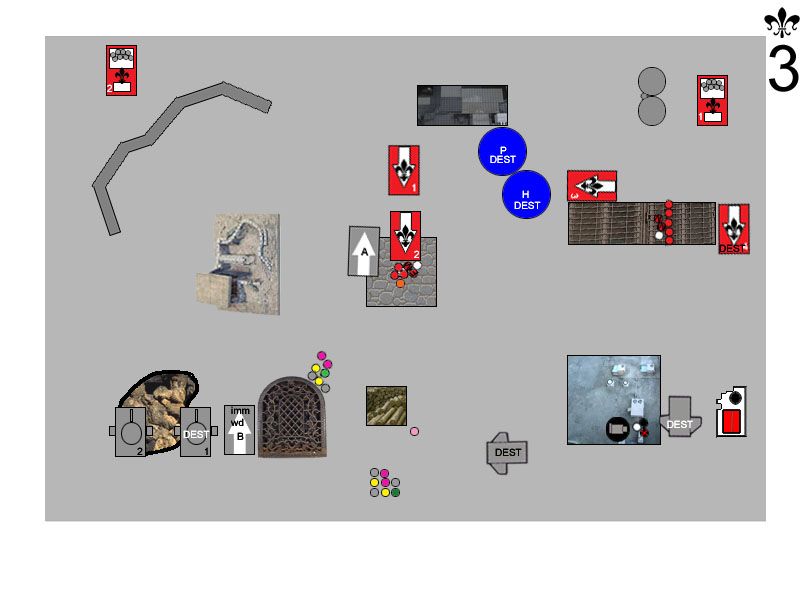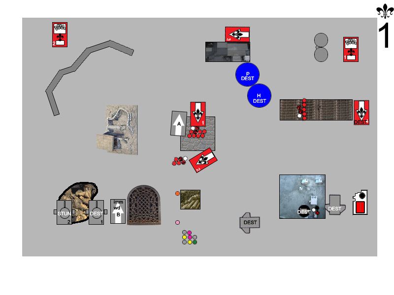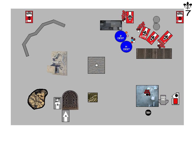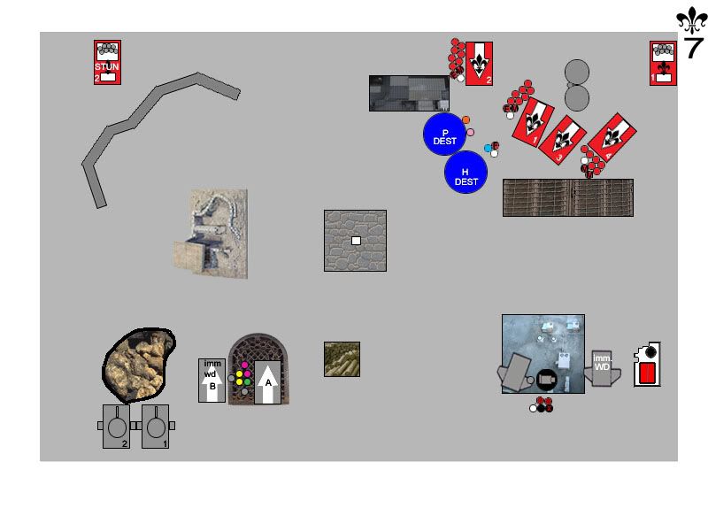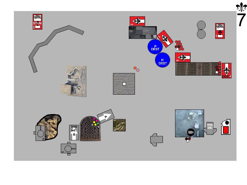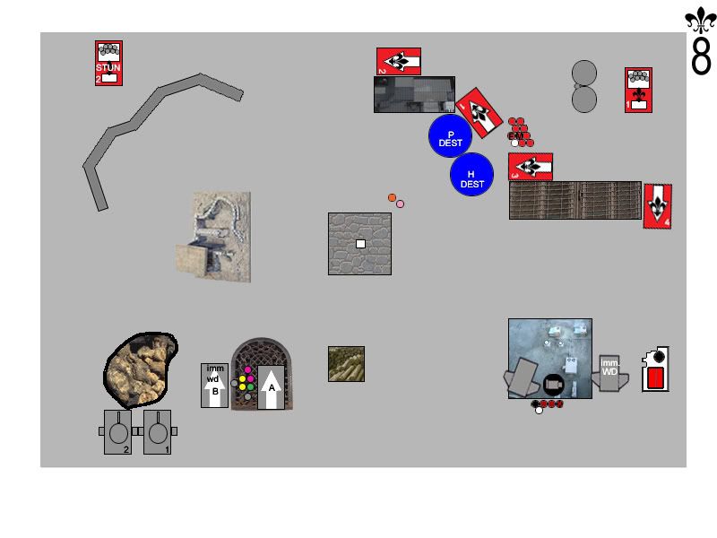 By request, here?s a key to the map: Witchhunters Turn ThreeRighteous Fury floated down out of the sky, alighting on the top of the Manufactorium. They drifted slightly toward the north, out of line of sight of the Dreadnought. Rhino doors flew open, and a legion of Battle Sisters stormed out into the morning sun, bolters locked and ready. Sister Megan Elizabeth led the charge against the Terminators, taking careful aim and dropping one with a well-placed blast from her Inferno Pistol. Quickly, the Wolf Priest covered the Terminator?s wounds with healing balms, saving his life. Below the Canonness, the Iron Fist prayed for Divine Guidance, and began to purify the Terminators with holy flame and bolter fire. Terminators started to fall under the weight of fire, and the Arm of the Emperor joined the prayer for Divine Guidance and added the weight of their own firepower. When the flames died down, the Wolf Priest was barely standing, heavily wounded, while one Assault Cannon-toting Terminator stood protectively over him. The Exorcist loaded up a rack of missiles, and took aim at the Land Speeder. Holy fire engulfed the hovercraft, melting the assault cannon right off of the frame, and utterly destroying the thrusters. The speeder sank slowly to the ground, immobilized. The second Exorcist lit up the lead Rhino, blowing off its storm bolter, then immobilizing it. Hunters spilled out, entangled in the wreckage, and one poor sod burned to death in the blaze. The Cleansing Fire turned their weapons on the Grey Hunters, but the Emperor had temporarily forsaken them, and they failed to receive Divine Guidance (always a double 6 when you don?t need one). The two Flamers combined to roast two Grey Hunters in their armor. The Purging of Heresy could no longer see the Hunters, and targeted the Drop Pod in front of them instead. The pod explodes in a massive ball of fire which engulfed many of the troops standing nearby. Sister Jessica dove for cover, her cloak protecting her from the worst of the blast. One unsuspecting Grey Hunter was hit with shrapnel and went down to the ground. Sister Superior Stacey called out to her unit, and they charged into combat with the Grey Hunters. Both Serpahim launched themselves at the Terminator, while Sister Megan Elizabeth swooped in to lend support. The Wolf Priest countercharged himself into the Seraphim. Sister Megan Elizabeth made short work of the Terminator, hacking him to the ground while the Wolf Priest brutally cut both Seraphim out of the sky. Sister Megan Elizabeth held firm, pressing in toward the Wolf Priest. The Grey Hunters savaged the incoming Sisters of Battle, killing three of them and losing only one Hunter in return. Badly decimated by injuries, the Sisters grimly held their ground. Sister Jessica swooped delicately overhead, and revved up her Eviscerator as she took aim at the remaining Drop Pod. Over and over, she swung at the Pod, until it exploded with a vengeance. Two nearby Sisters fell to the shrapnel, three Grey Hunters were hit by falling debris and were knocked out, and the Wolf Priest turned around, his eyes wide, as the drop pod?s control console flew out of the sky and crushed him. Space Wolves Turn ThreeA pair of Predators rolled onto the battlefield, and took up position on the left side of the compound. The second Landspeeder floated gently out of the sky, hovering just on top of the Manufactorium. The Venerable Dreadnought Odin punched its way to the top of the building, but accidentally immobilized itself in the process. The Wolf Guard Battle Leader crept up into the shadow of the building and prepared himself for battle. Sensing they might be in danger, the Seraphim prayed for the Spirit of the Martyr to watch over them. The Predators opened up on the Exorcist, but the obscuring rocks helped protect it somewhat, and the crew ended up only stunned. Tornado let loose on the Purging of Heresy from its vantage point atop the Manufactorium, and one Sister went down while the rest ducked for cover. The Dreadnought?s assault cannon whirred and its storm bolter popped, shells riddling the Seraphim. The Spirit of the Martyr guided the bullets away from all but one of the Seraphim, however. The lone Grey Hunter sliced two Battle Sisters down with his power sword, and the shocked Sisters could do nothing more than circle the battered warrior and hope help would come. The Wolf Guard Battle Leader charged up the stairs of the Manufactorium, utterly surprising the Seraphim as he rushed into their midst. Two of the Seraphim were on the ground before the unit recovered and began to fight back. The Wolf Guard Battle Leader was wounded, and the Seraphim quickly activated their jump packs and floated away to safety.  Bullets are flying, Sisters are dying, and neither side is any closer to the objective. What will happen next? Who has the upper hand? Discuss!
