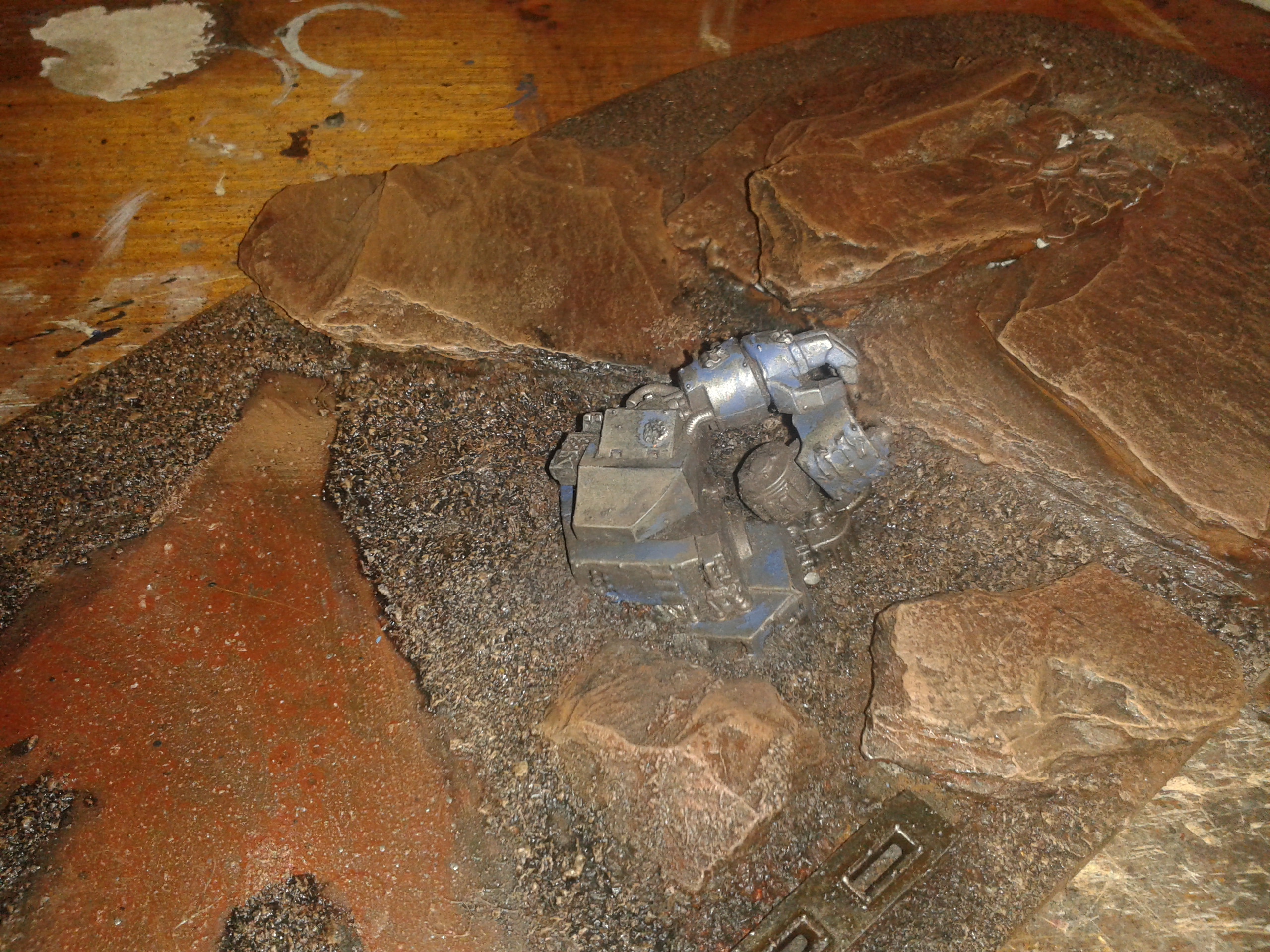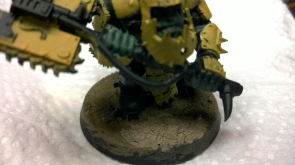 How I went forward was PVA glue, sand, crackle paint, thinned down PVA glue just to be sure, I then primed my model, basecoat of Steel Legion Drab, Devalin Mud shade and Bleached Bone highlight.