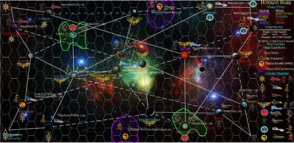 The Chaos (that's me!), Eldar, Necron, and Tau factions starts in their respective deployment zone in the corners, Imperials start on three of the Major Planets, Tyranids have invasion points that are basically deployment zones but in weird spots, Orks start their waaghs based off minor planets, and there are no Dark Eldar at the moment (though I hear we might have a