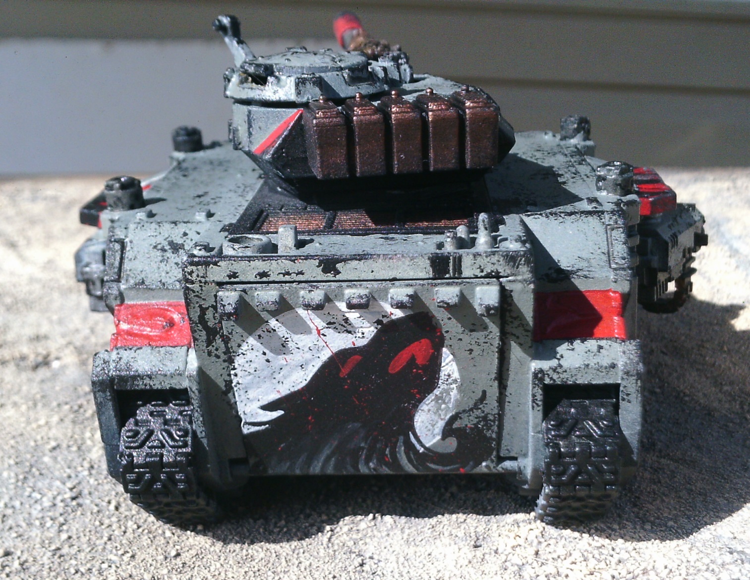 First up is a Space Wolves Pred. The client had already assembled it, and carved some runes or something on it, and he did a really solid job of magnetizing the whole thing, so that he could play it in any configuration. It was really great to work on since it had been assembled so cleanly and magnetized so well, I just had to do a tiny bit of putty work around some magnets but that was just so that I could have some unevenness to chip the paint on. As usual though, I couldn't leave it alone so I sculpted up a wolf head autocannon using a thunderwolf head and some milliput/greenstuff mixed up.