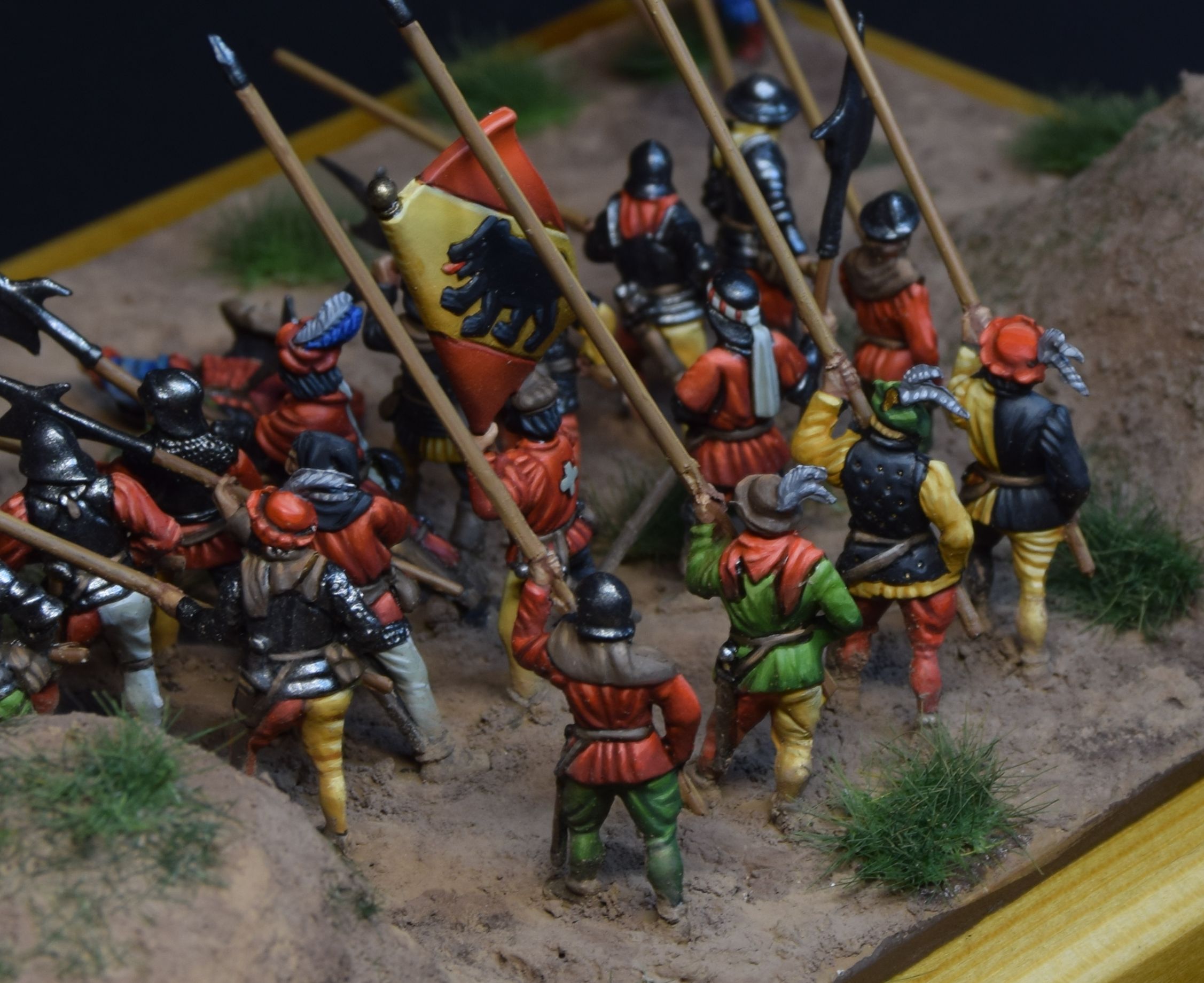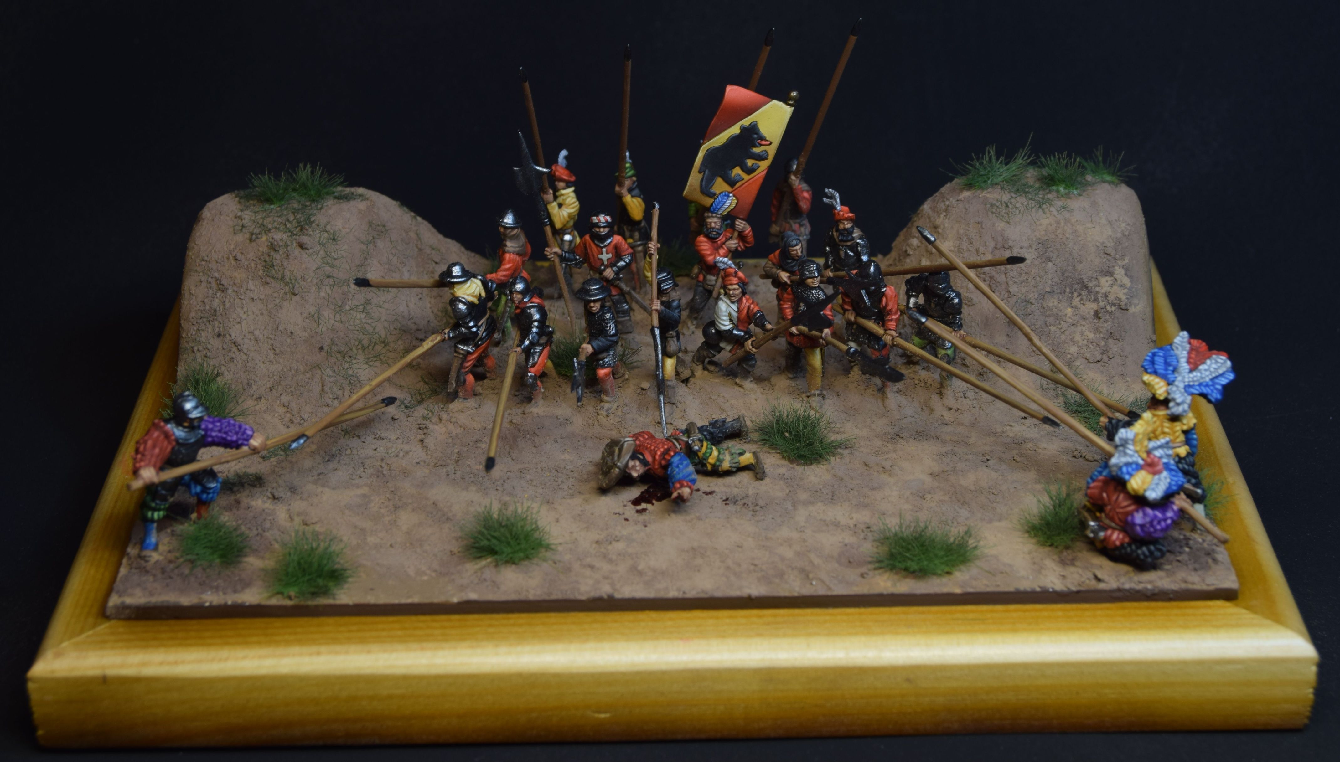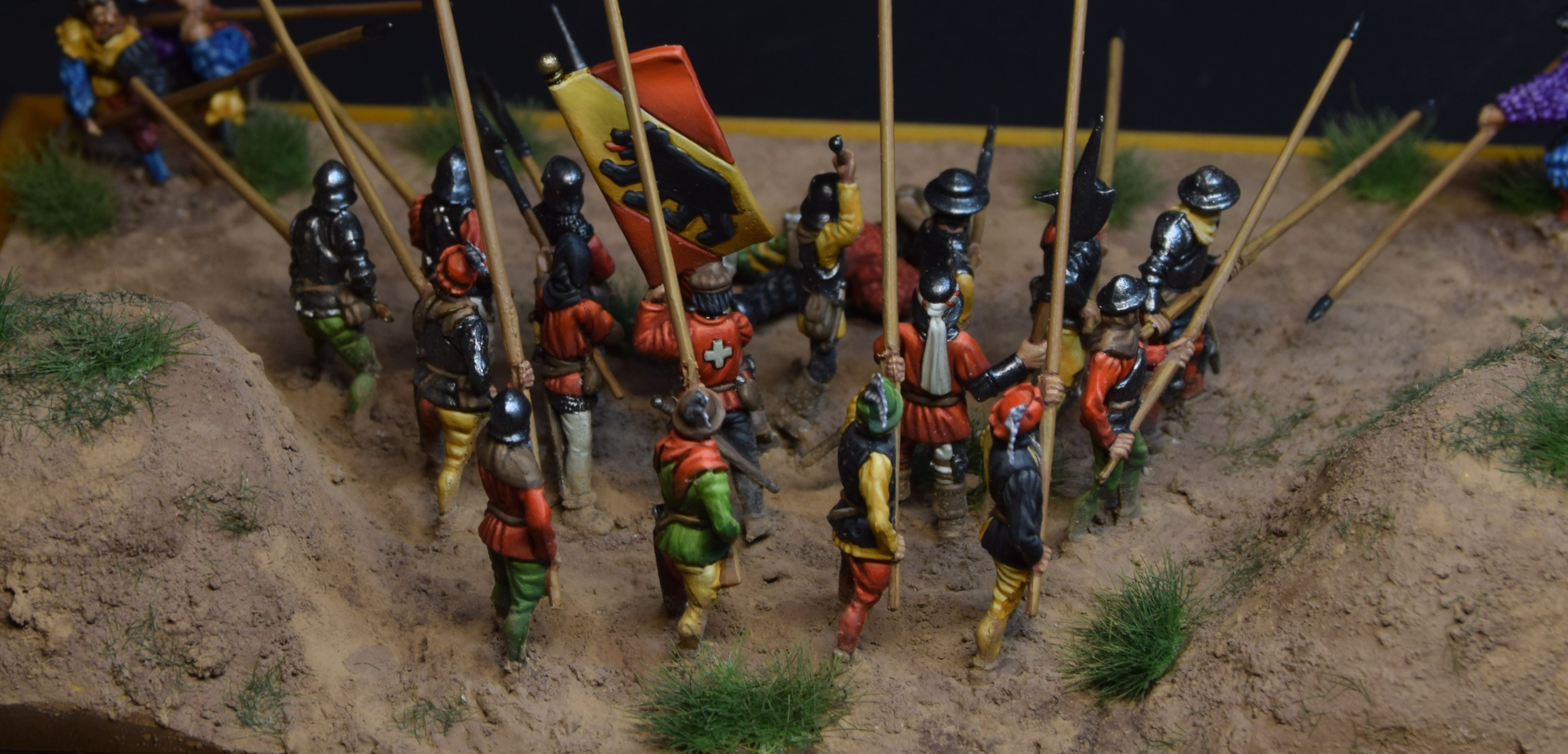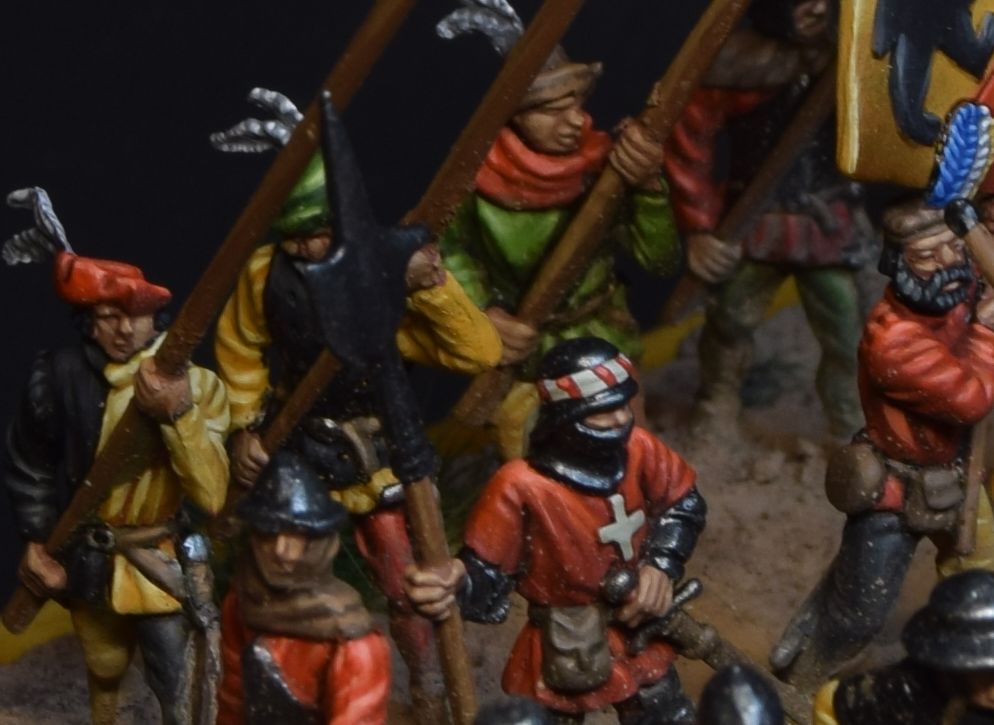 Figures don't match each other really well by historical means - swiss are from 15 century, landsknechts are more into 16-th. This was the owner's desing, so don't be too strict)