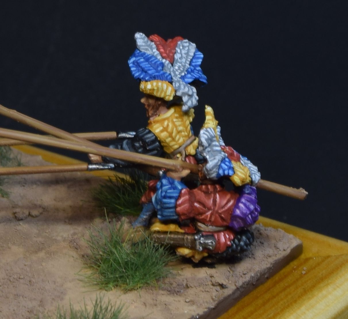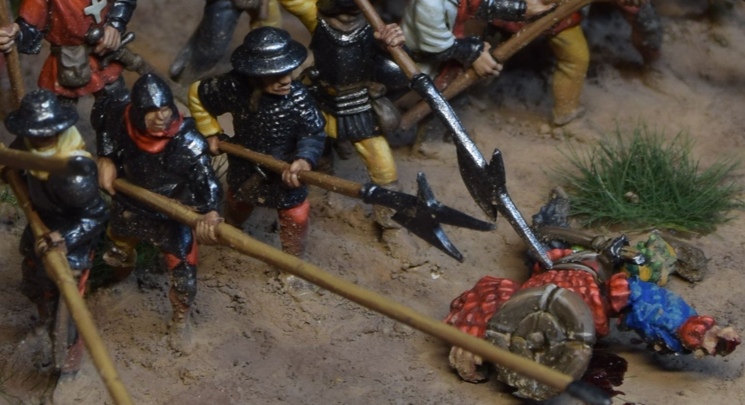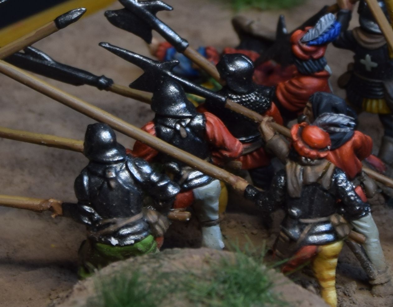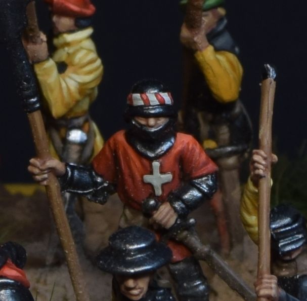Figures don't match each other really well by historical means - swiss are from 15 century, landsknechts are more into 16-th. This was the owner's desing, so don't be too strict)