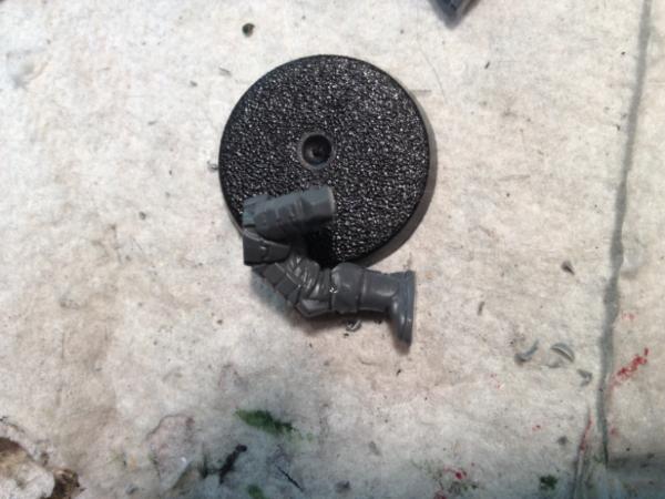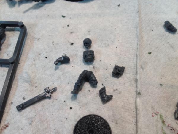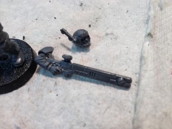 The arms were more interesting. For the right arm I took a Guardsman's arm and cut the las rifle off. I then carved a pulse rifle off a Tau arm and combined them as such. Left arm is actually a Tau arm, but I shaved the hand to make the third finger less prominent.