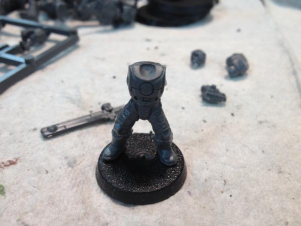 I started by converting the legs, taking a set of Tau legs and cutting them just below the knee, and a set of Guardsman's legs and cutting them just above the knee. I then did some shaving to have them match up better.
