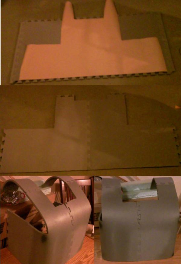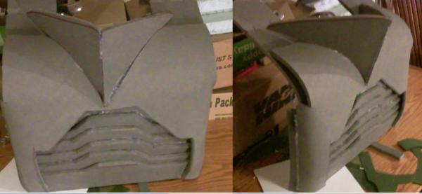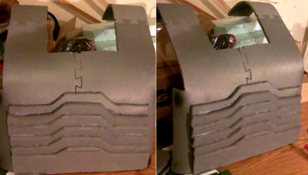 using a shirt for a guide I took measurements and made a pattern out of packing paper. I then drew the pattern out onto two sheets of PVA foam. I then cut out the pattern using my hot knife. I then used a heat gun along the edges. you have to be carefull with that you don't want to blister the foam or melt it. I used short charges of the heat then while its soft I bent it into shape. Rinse and repeat until it was just the right shape. I then too dollar store cutting sheets, and used it to seal the seam