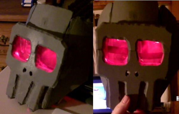while I was working on this I felt I should make a battle mask so I could wear it as a just a costume with out to much trouble. So using left over pva foam, some red leds and a cheap jason mask I built this.