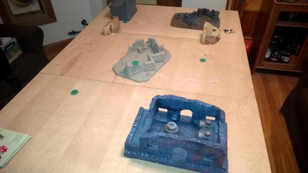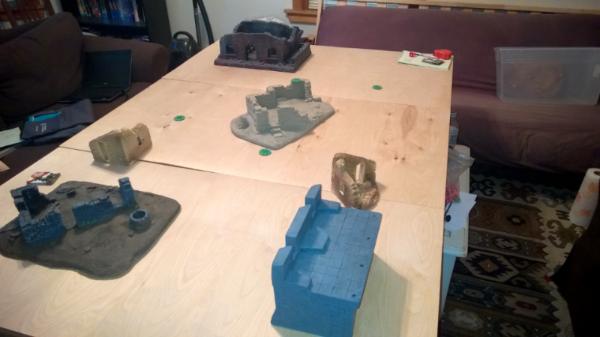 We each got to set up half the terrain and my opponent deploys the biggest piece of terrain he has in the middle and I put everything as far to the edges as possible because call me Susan Gibson, I need wide open spaces.
