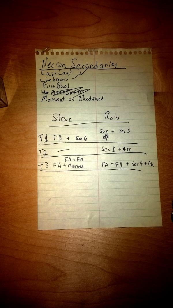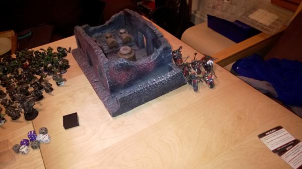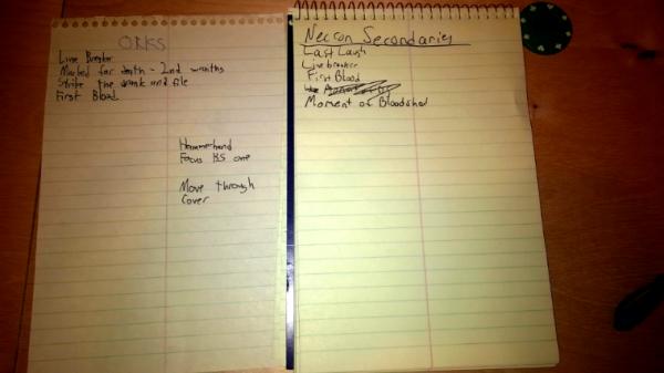 Mission specifics - each Fast Attack choice killed was worth a VP, each secondary was worth 2 VP, modified maelstrom deck with VP scored every round, and each objective was worth between 1-3 VP (scored at the end of the game). It's a lot to keep track of, I think there's pictures of the stenopad we used to track the scores somewhere on here (complete with my sloppy handwriting).