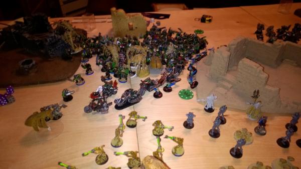 So I was disappointing that it came to that. I rolled the bike jink saves just for my own sake and I would have only lost one bike. I would have kept the protective layer between my green tide and the mob. maybe with another good waagh turn I could have multi-assaulted his entire right flank and then just kept them locked up all game and hoped that my warboss and lootas would eventually win their fight. I don't know, but it certainly would have been better odds than where I was.