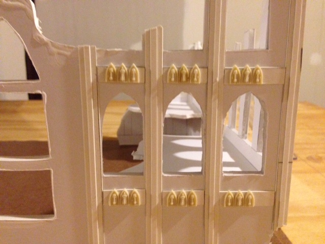 Here is a few updated shots. I finished the vertical and horizontal detailing on the front and sides finally. I also tried my hand at some resin casting of some spare bits and was quite pleased with how they turned out. As you can see I am using them to decorate under each window. I like the look so far. Hopefully we will work on the tile flooring this weekend.
