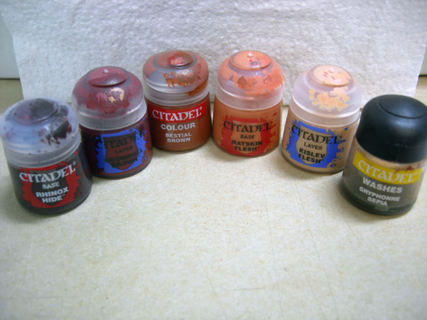 These are the colours I use for the different shades of skin: Rhinox Hide, Doombull Brown, Bestial Brown (or the newer equivalent), Ratskin Flesh, Kislev Flesh, and Gryphonne Sepia (or Seraphim Sepia) wash. You'll also need some kind of decent fine-detail paint brush.