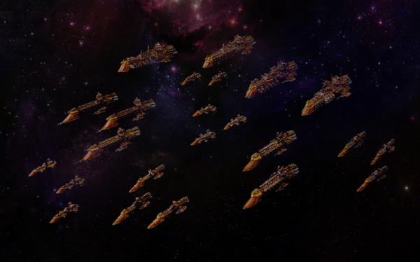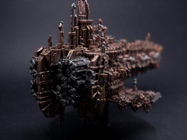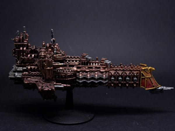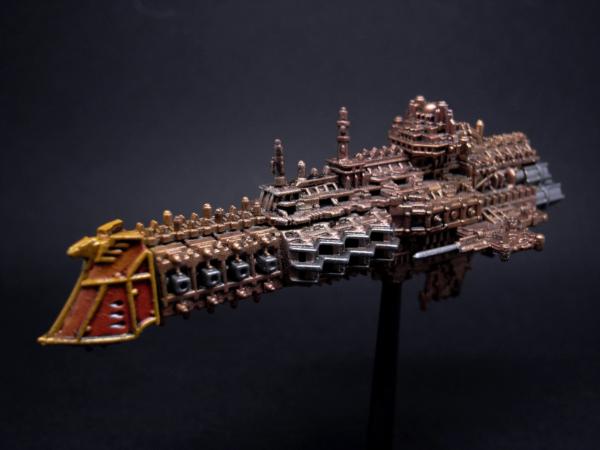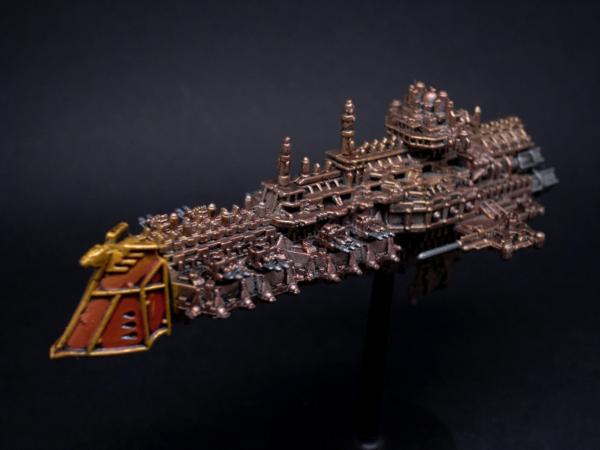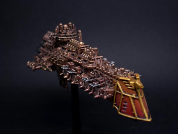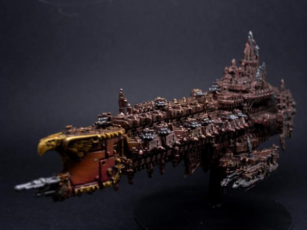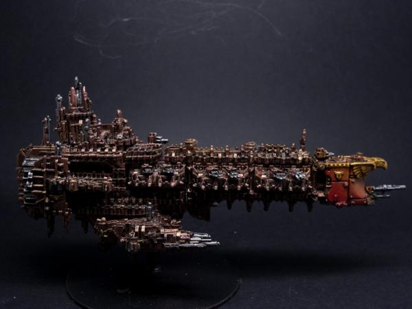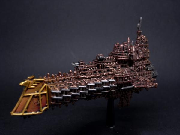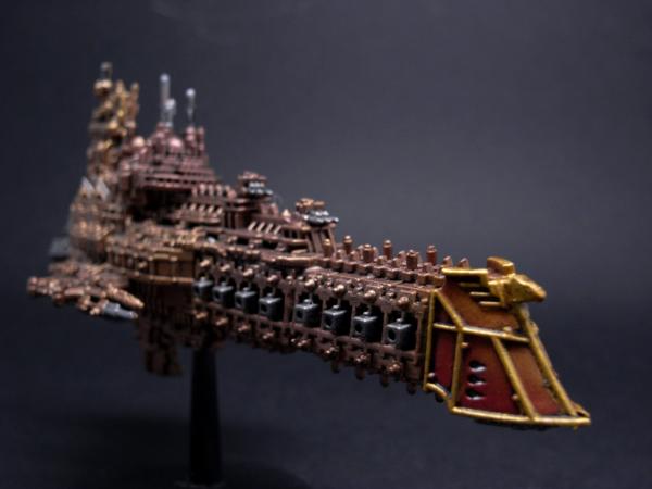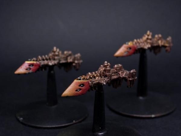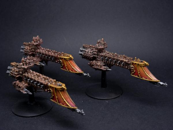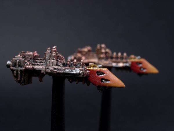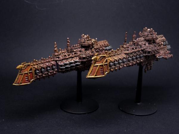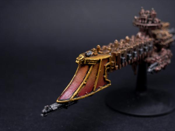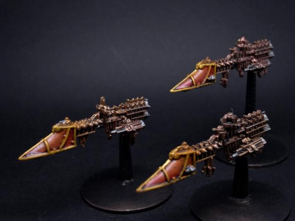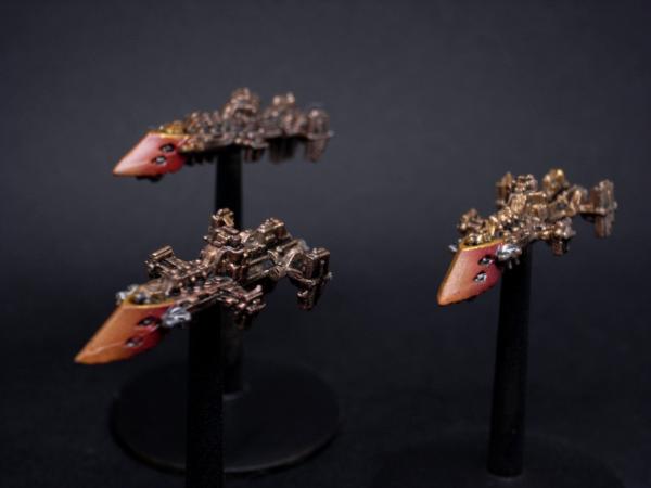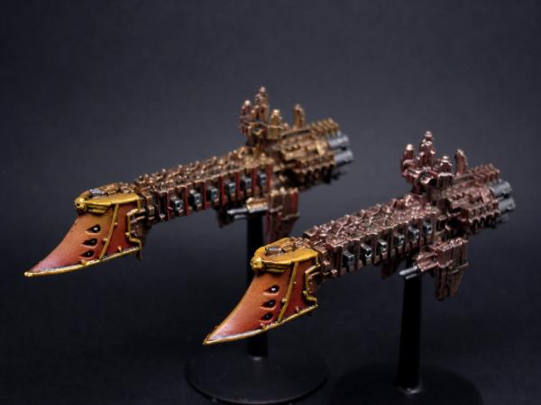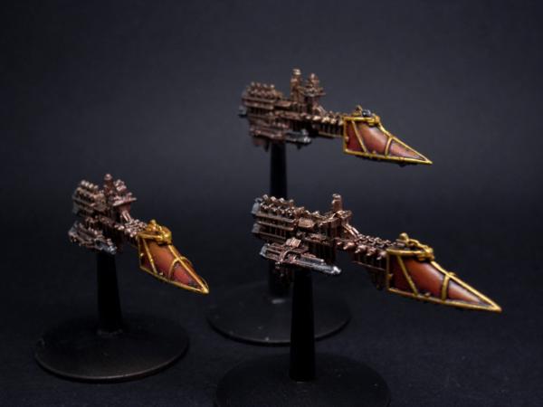 Finally got around to finishing the first batch of my first BFG Imperial Fleet! I have another small batch to come with some bigger ships, but those require some GS work so might take a little longer. This took roughly two days to paint, mostly with spray cans and airbrushes. The base colour is Copperchrome from the Montana Gold spray range, which gives a really nice shiny pinkish colour, highlighted with VGA Polished Gold, and the prows done with a mix of VMA rust colours. The whole fleet was then gloss varnished and oil washed with a light coat of Lamp Black, which was then removed from the prow plates. Super-fast!
