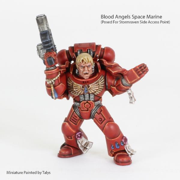 As you can see, that turned out ok-ish too. Because he's hanging off the side of the Stormraven, I didn't bother with some of the details like squiggles on the purity scrolls, because you can't see them anyhow. Still, I didn't really cut any corners with the space marine -- there 3-layer highlights on all the power armored parts, and all the little details are done.