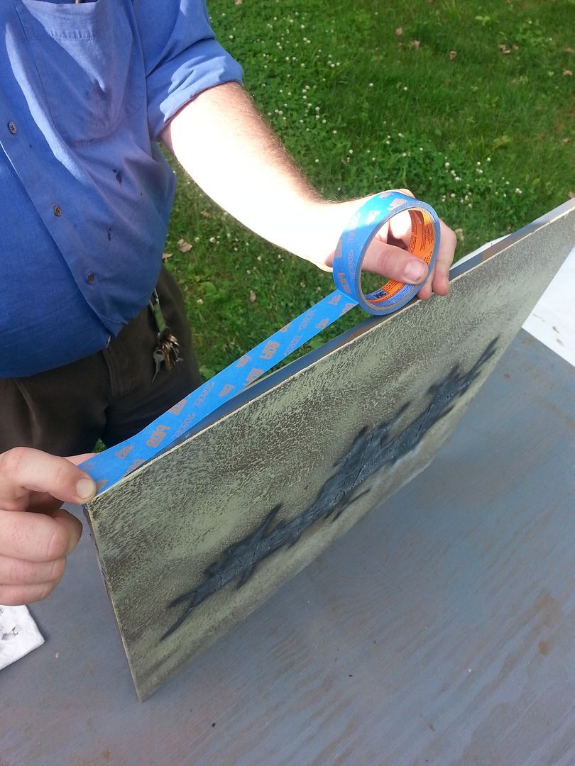 Make sure you tape the edges here. Now I didn't do this when I painted it but I didn't really feel I had to. Some folks do and that's great. It's really up to you. But for the gluing and grassing this is a MUST stage. Painters tape is the easiest to use. I had two rolls, one large and one thin. I used both. An extra set of hands help if you can get your friends to help.