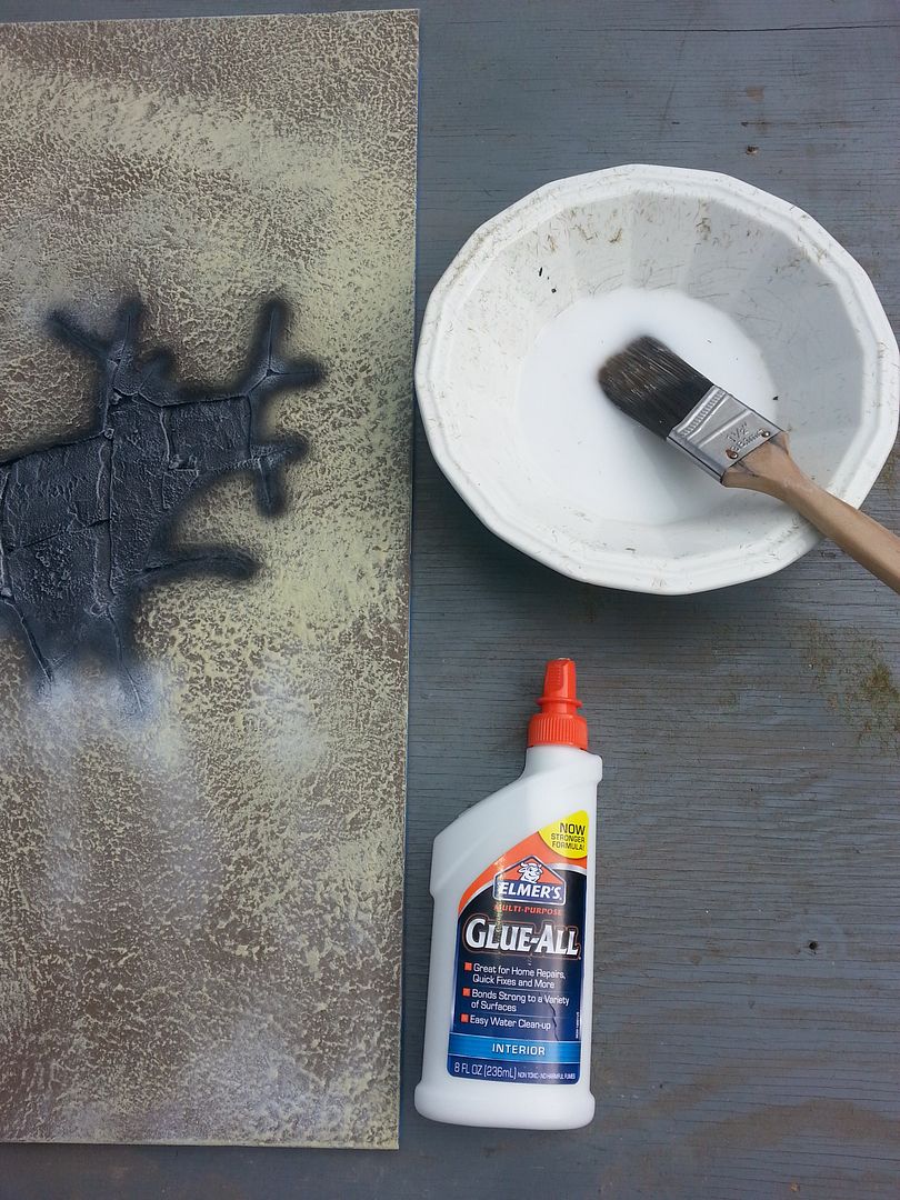 Glue. OK friends, if you take anything away from this here is point 1 for tips. Spend the extra for the heavy glue. Guys and gals, the school elmers is NOT good enough. It will work in a pinch but I did both and by far the stuff you get at the hardware store is superior. Get a bowl and add a little water to it. Squeeze out the glue on your board. Paint it around with a painter brush, dipping the brush in the water. This is a gradual thin and I found it worked great. You could mix the stuff before, but its a bigger mess than what you need. I painted each section into areas, undefined so I could mess the grassed zones. no geometrical lines to make it look natural and thinning in places, like a swamp. Small subtle lines running along the base of hills and rocks for instance.