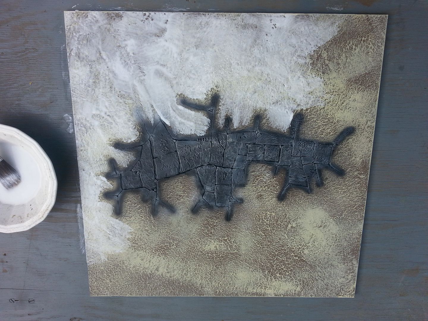 I did a VERY liberal dry brush with the Ushabti Bone. The one black tile was the test tile. You need to let the latex dry well overnight. Now to move onto the next stage, I took the time to matte dullcoat the board. I decided to do this here. This made the next stages much easier to do. Later, we applied more protection, but this small step here helped preserve parts of the board during the process.