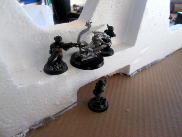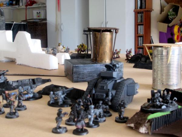 Interference meant he was unable to order any bombardments this turn. One squad of Guard moved into the factory, setting their traps through it. On his right flank one of the command squads run up past the demolisher, but staying tight to the walls. They were following the first squad that had been moving forward.
