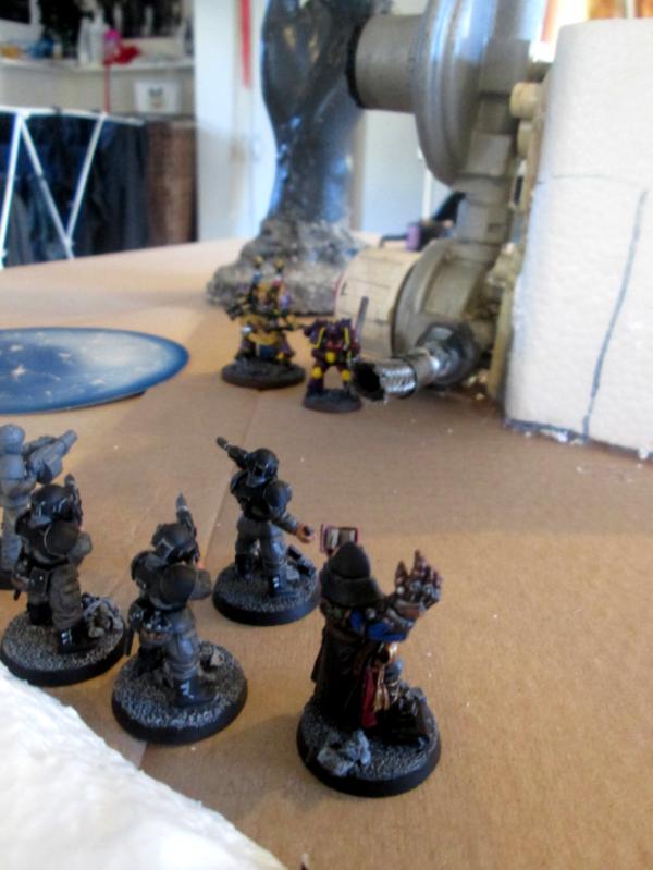 My Noisemarines manage to slaughter half of the command squad they could see through the walls of the factory complex, heads popping and bones shattering beneath the sonic onslaught. Luckily for the Guard, the Colonel held the ranks in line. This also provided me with plenty of summoning points right off the bat!
