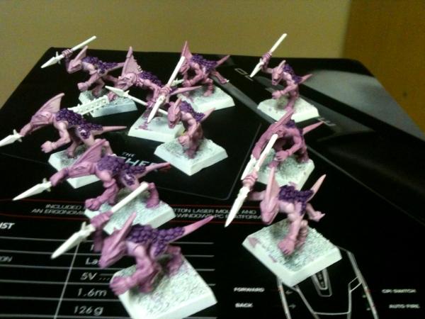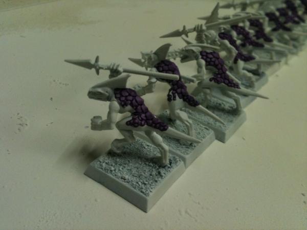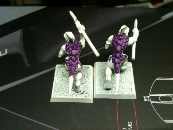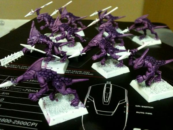 Paint the scales with a mix of Liche purple and black. Use it heavily watered down, and you'll get the "highlighted" look. Dont water it down so much that it becomes like a wash, you still want decent coverage, just not perfect coverage. (3 minutes per model)