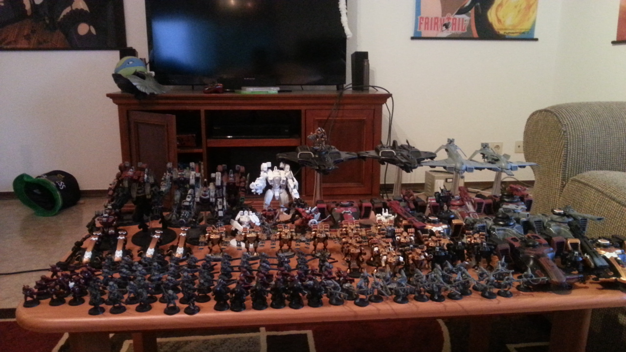 Hey everyone, Alright, i am getting out of 40K and i decided to put my army up for sale. The army is mostly painted farsight enclave. This is the following army list: Commanders: Farsight $50 Cadre Fireblade $20 Eldrad $20.75 Elite: 18 Crisis Suits $390 6 Riptides $510 6 Stealth Suits $53 Troops: 72+ Fire Warriors $217.50 24 Kroot $72.50 Fast Attack: 24 pathfinders $70 2 Razorsharks $130 4 Devilfish $149 75+ Drones $268.75 Heavy Support: 5 Hammerheads/Sky rays $300 2 New Broadsides $100 9 Old Broadsides $180 ForgeWorld: 4 Tetras £72.00 2 Barracudas £155.00 1 Shas'o R'Alai £34.00 1 XV9 Phased Ion guns £32.00 1 XV9 Fusion Cascades £32.00 2 Stealth Fighters £35.00 As you can see this is a very big army, Comes with foam as well, i also have bits for days. Games workshop and forgeworld total is $3084.12. I will not part out this army, either you buy everything or nothing so please don't waste your time and mine. I am asking for $1200 obo for everything. i'll even throw in free shipping. This is the last post before I put it on ebay. I am stationed in Germany, thats why it shows me there. Please no low balls and i will send pics upon request. Thank you.