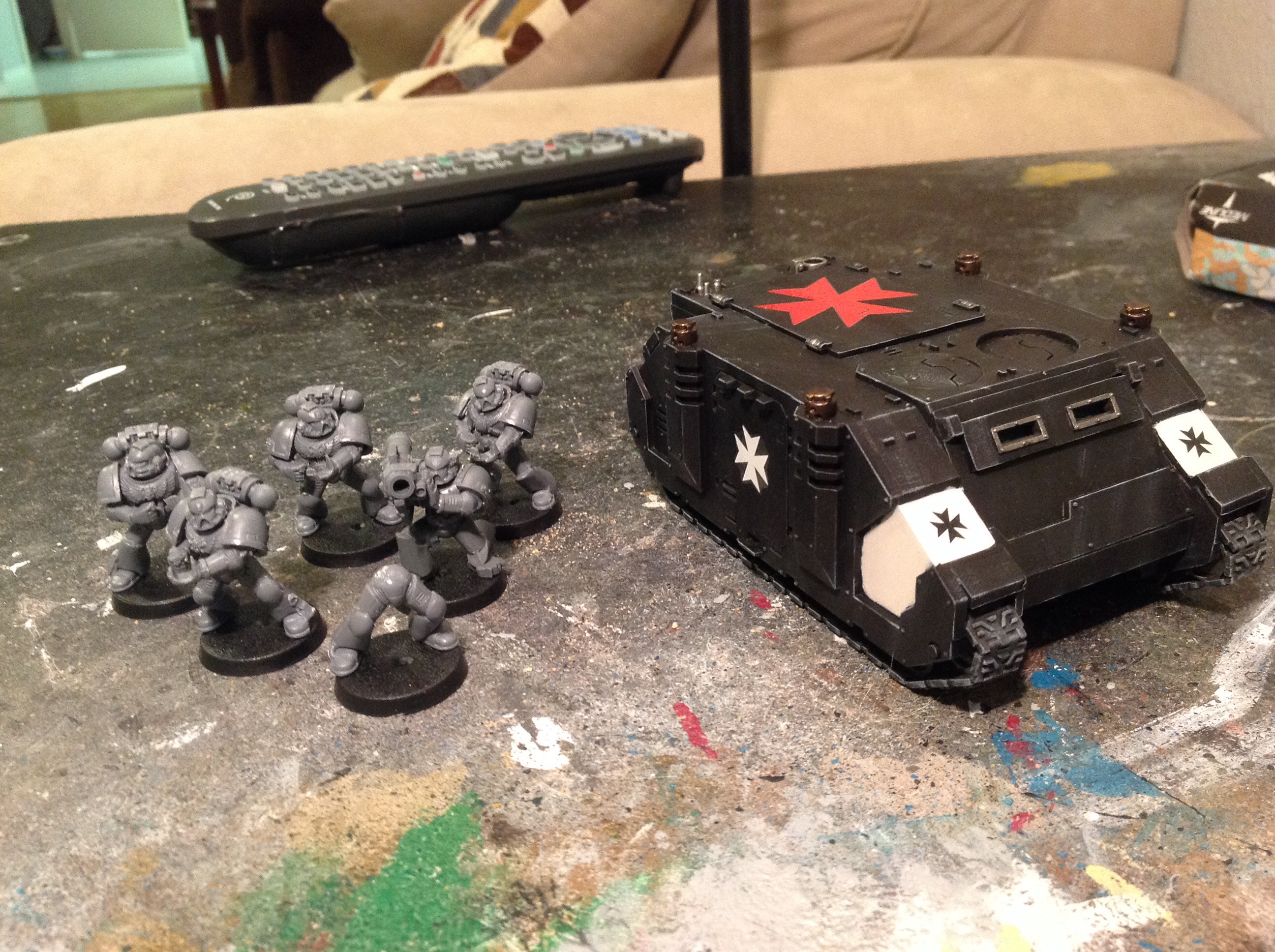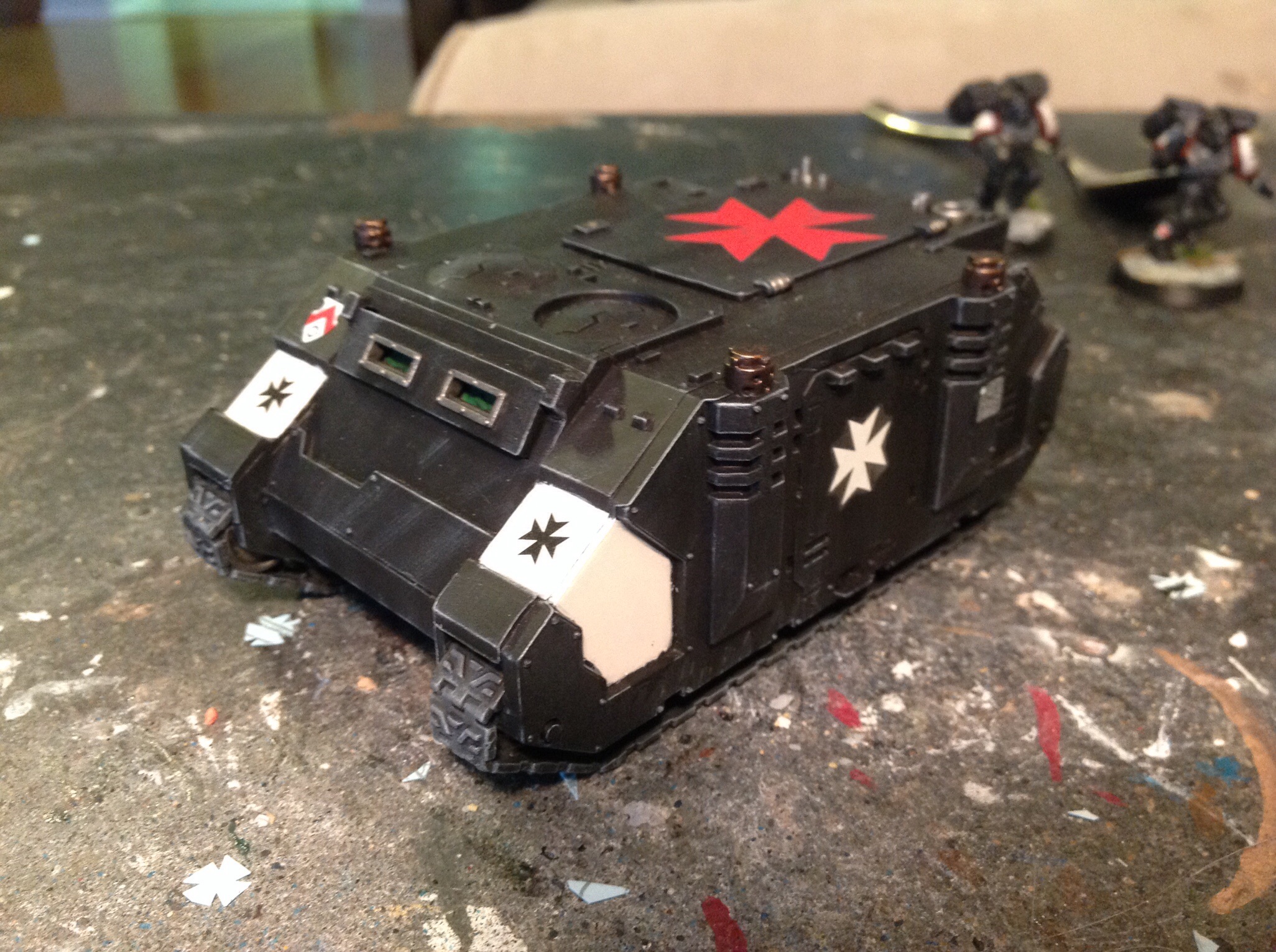 Speaking of which, a minor update. The rhino is sporting one of the forgeworld transfers. I'm going to have to think on exactly how to use them. I have 4 sheets, but still. Waste not want not, right? I've decided the 3 crusader squads will have an extra guy to soak up a wound. 6th initiate for this one, neophytes for the others. Waiting on the tabard bits for the sergeant.