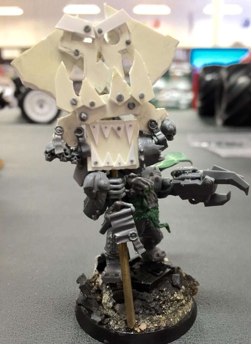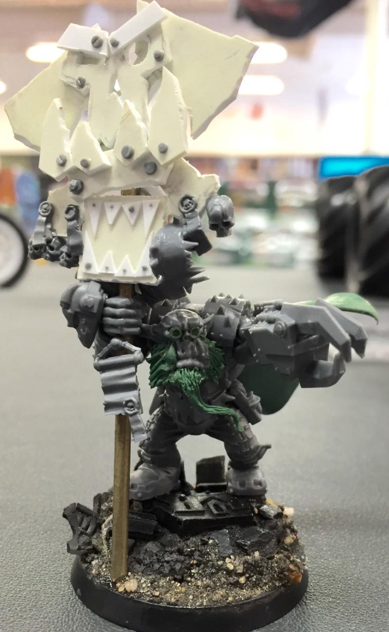 What is he in game terms? A nob with Waaagh! Banner? A Warboss with Lukky Stikk? It almost seems like he needs to be a custom Warboss with the warlord trait that allows all units within 12" to use his Ld (due to his preaching). If someone brought such an awesome kustom model to a game with such strong fluff, I would let them use it as a special character with a specific trait instead of rolling randomly.