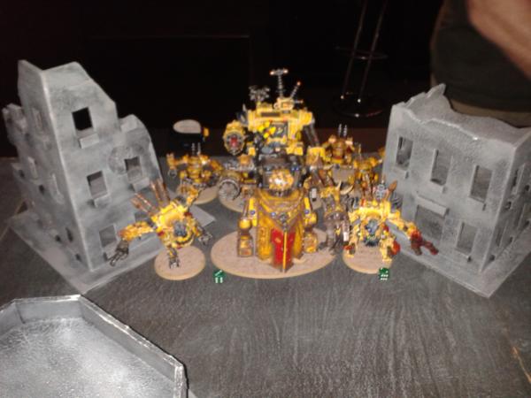 Sebastian set up the Gorkanaut directly opposite the Relic, with the Morkanaut behind it. A couple of Deff dreads and a unit of Kans backed up the large walkers in the centre. The Rokkit Kans went in a set of ruins to the right of the Nauts and one Deff Dread and unit of Kans deployed opposite the bikers on my right flank.