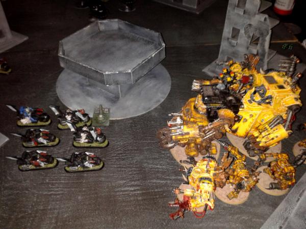 The bikers gunned their engines and advances on the Ork mob, the Grav gun squad moving up to claim the Relic in the centre of the board.