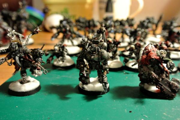 Cheap being the optimal word so apart from the cheap roll of 2mm chain to string from head to hands, coupled with a classic black colour scheme the only other touches of servitude added at this point would be the generic orange halo around the Thallax’s head to represent outside influence and some green glyphs on their shoulders as 30k Chaos ‘branding’.