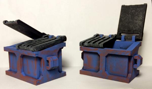 The tops open and close. Easy to assemble (though shoving the hinge through the back was a bit hard) and easy to paint. Two colors of spray paint and some gray and rust dry brushing. Fast.