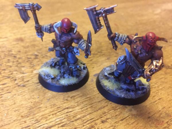 Thanks for the comments! The skin was pretty easy to do, actually; just Mournfang Brown, highlighted with Skrag Brown, inked with Agrax Earthshade, then highlighted once more with Skrag. I've got some more Blood Reavers in progress (pic below), so we'll see how this scheme looks on their faces.