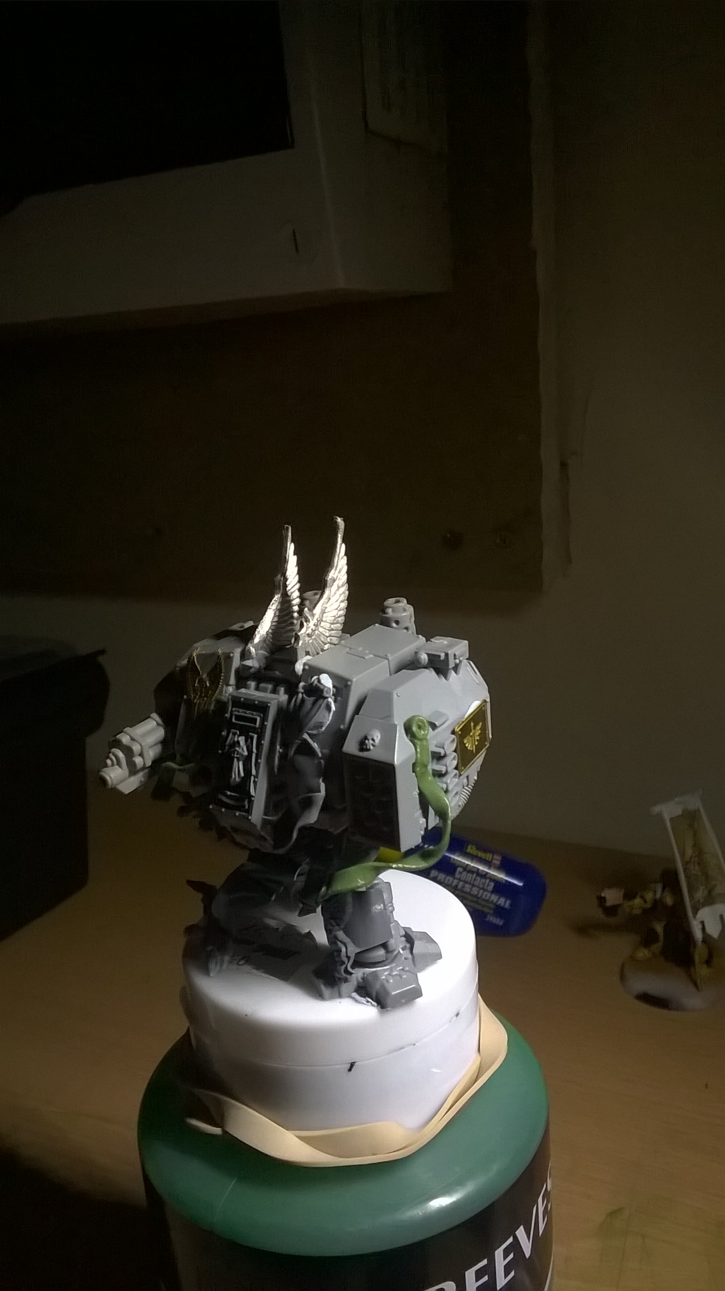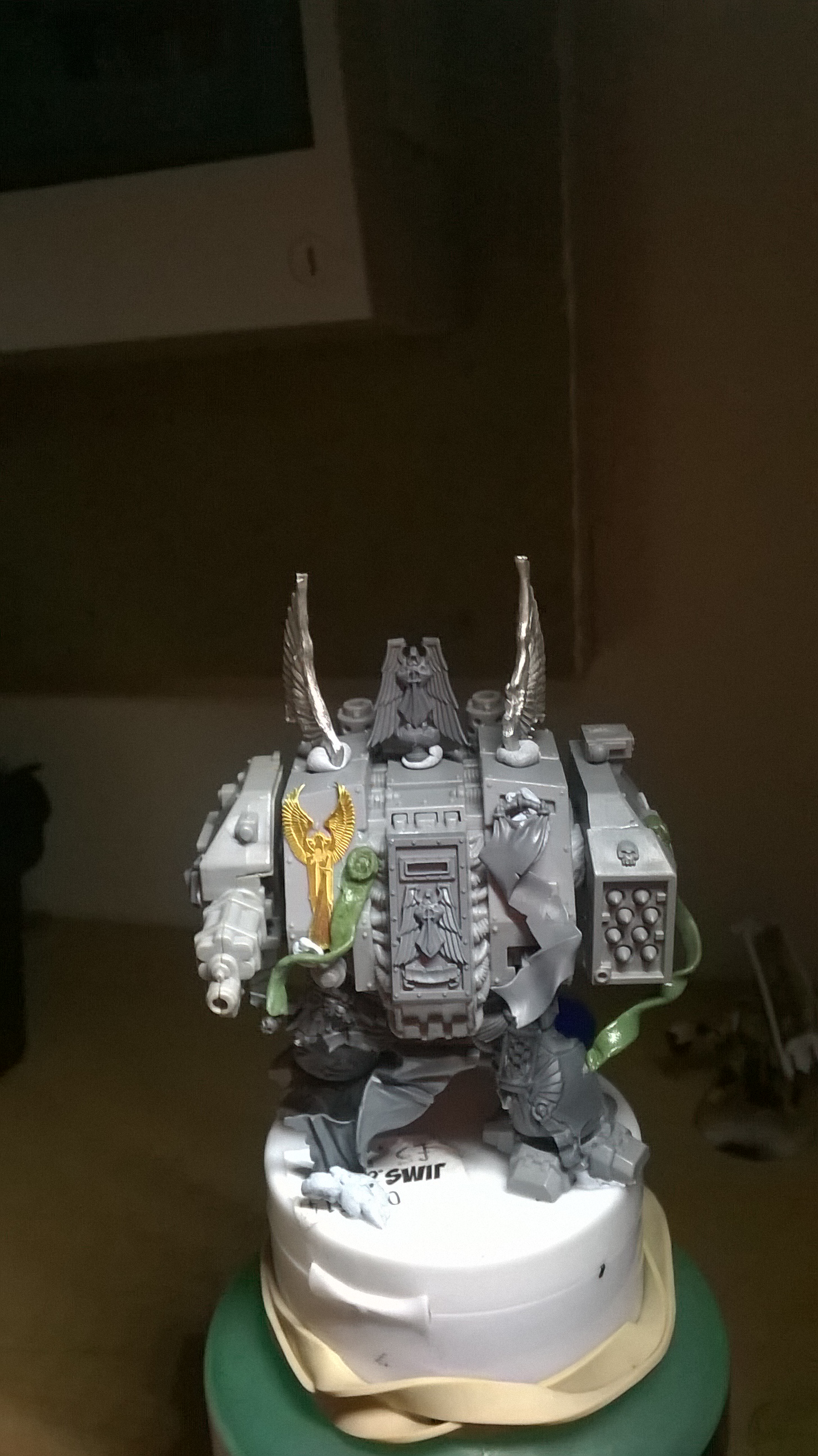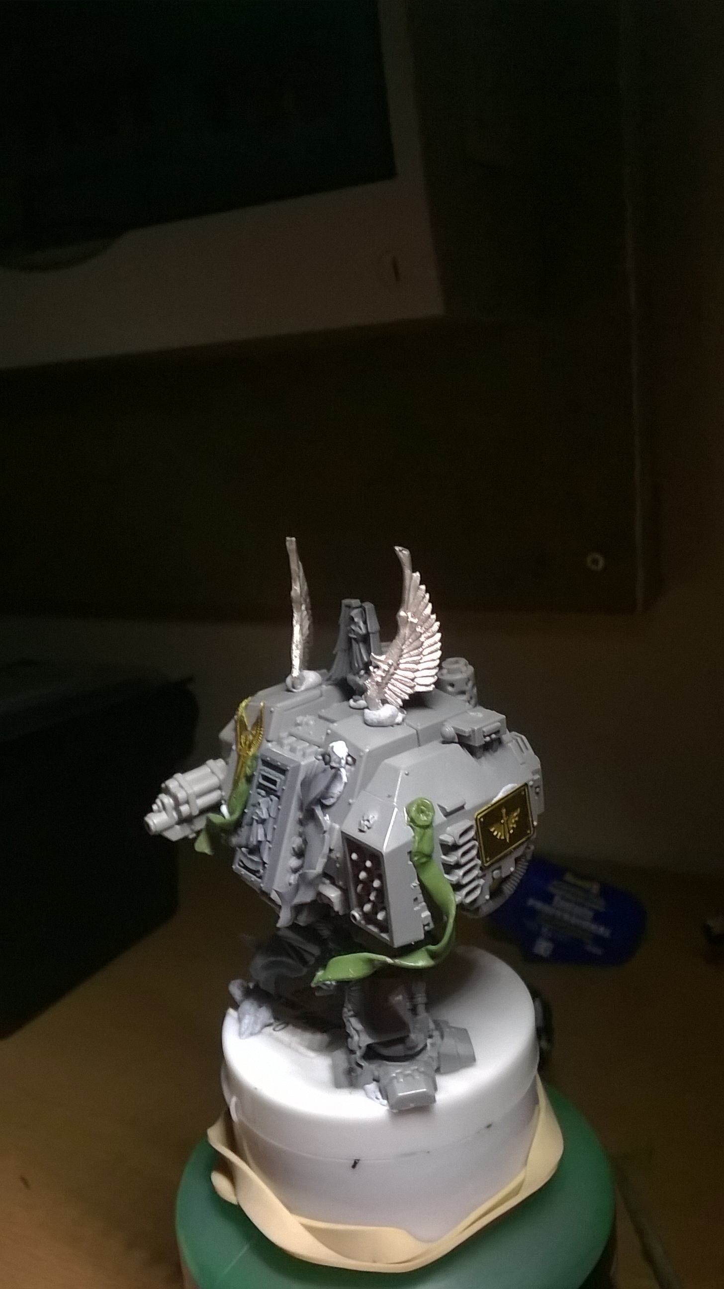 DA Icon on top of the sarcophagus is a good idea. I like it up there and it'll look cool on the final product. I would leave the swooping hawk wings off for two reasons. One: More fiddly bits to get knocked off of the mini during general use. Two: They look elven/alien, since they come from an Eldar model, and are not man-made looking.