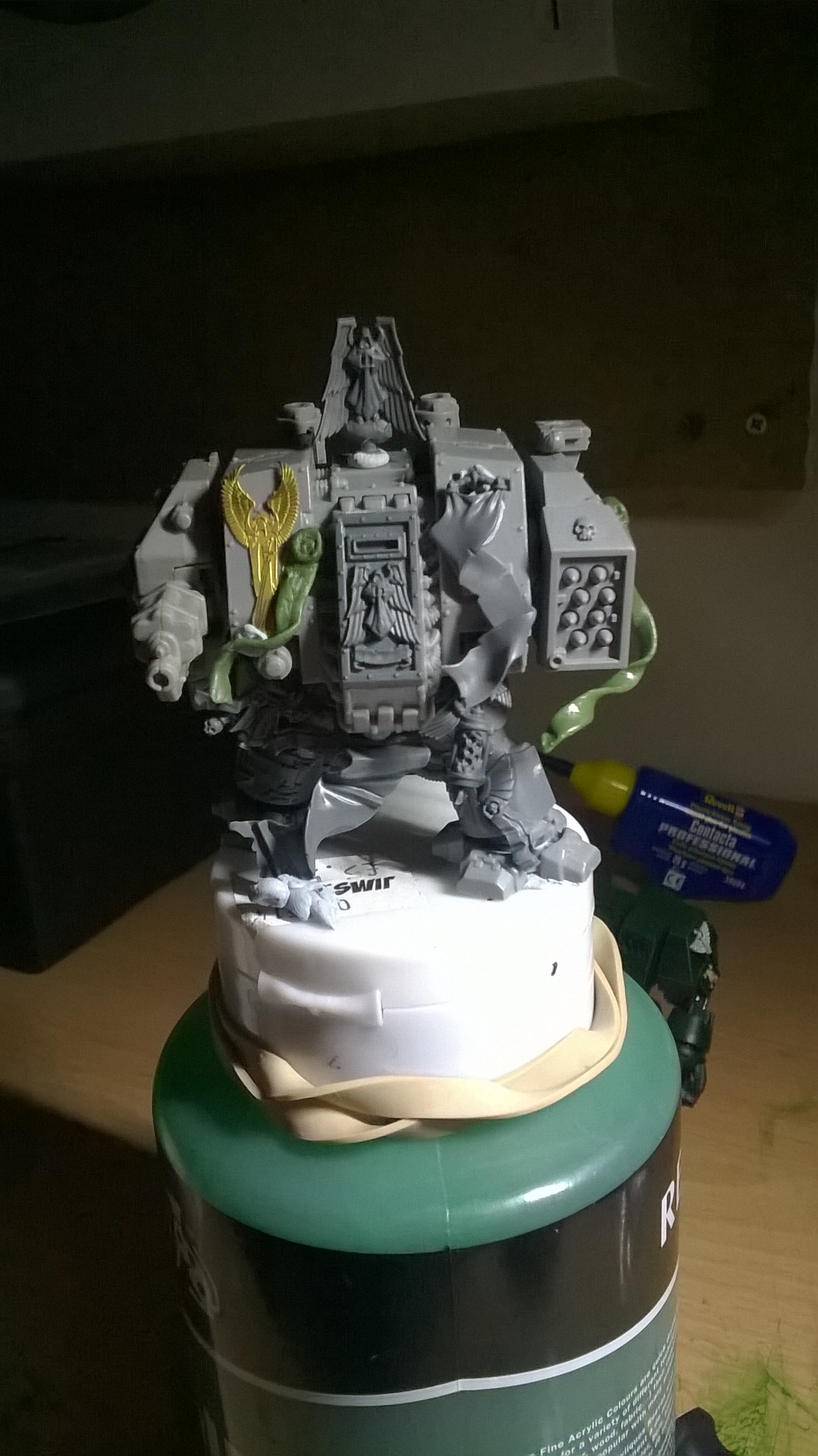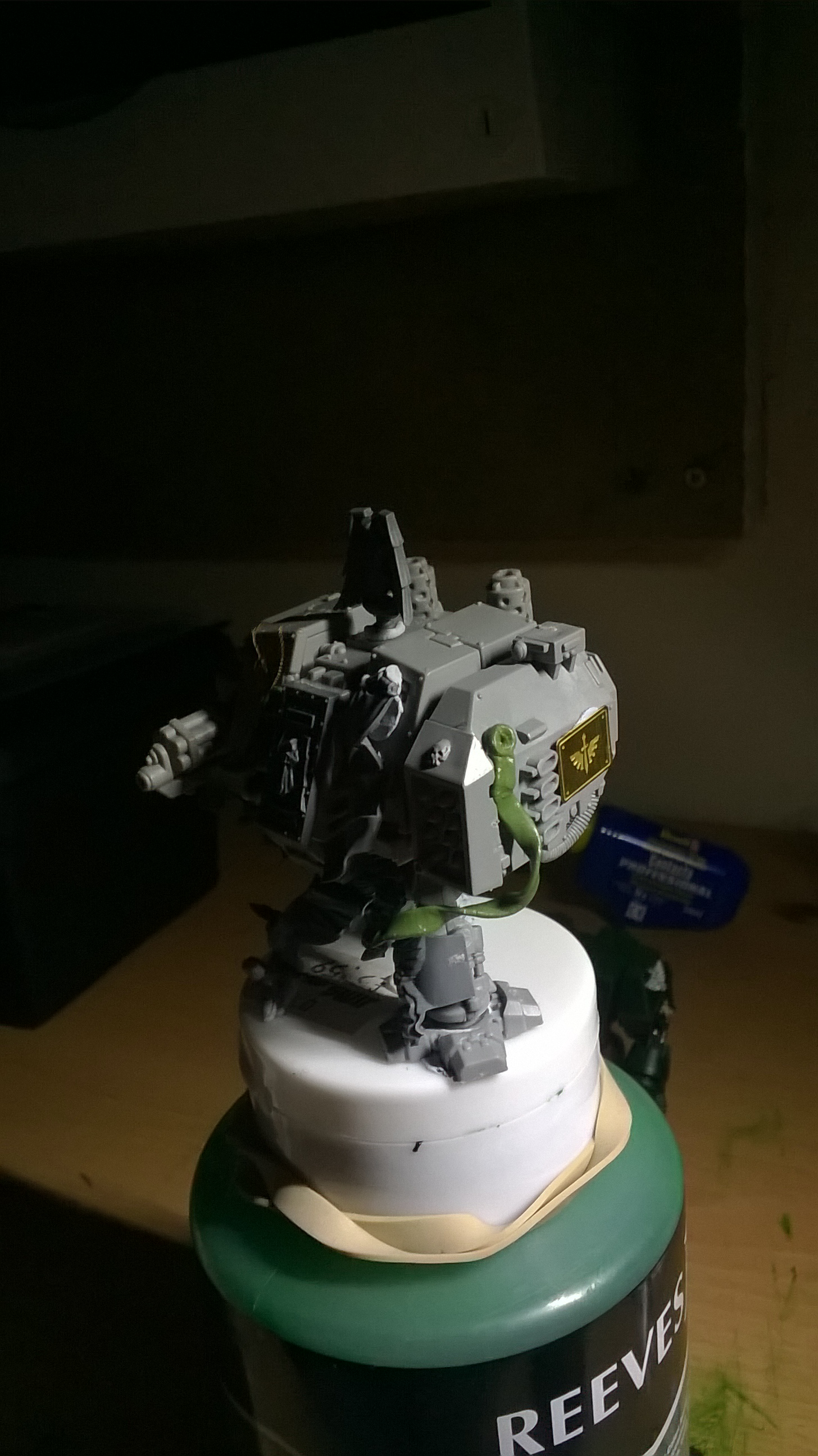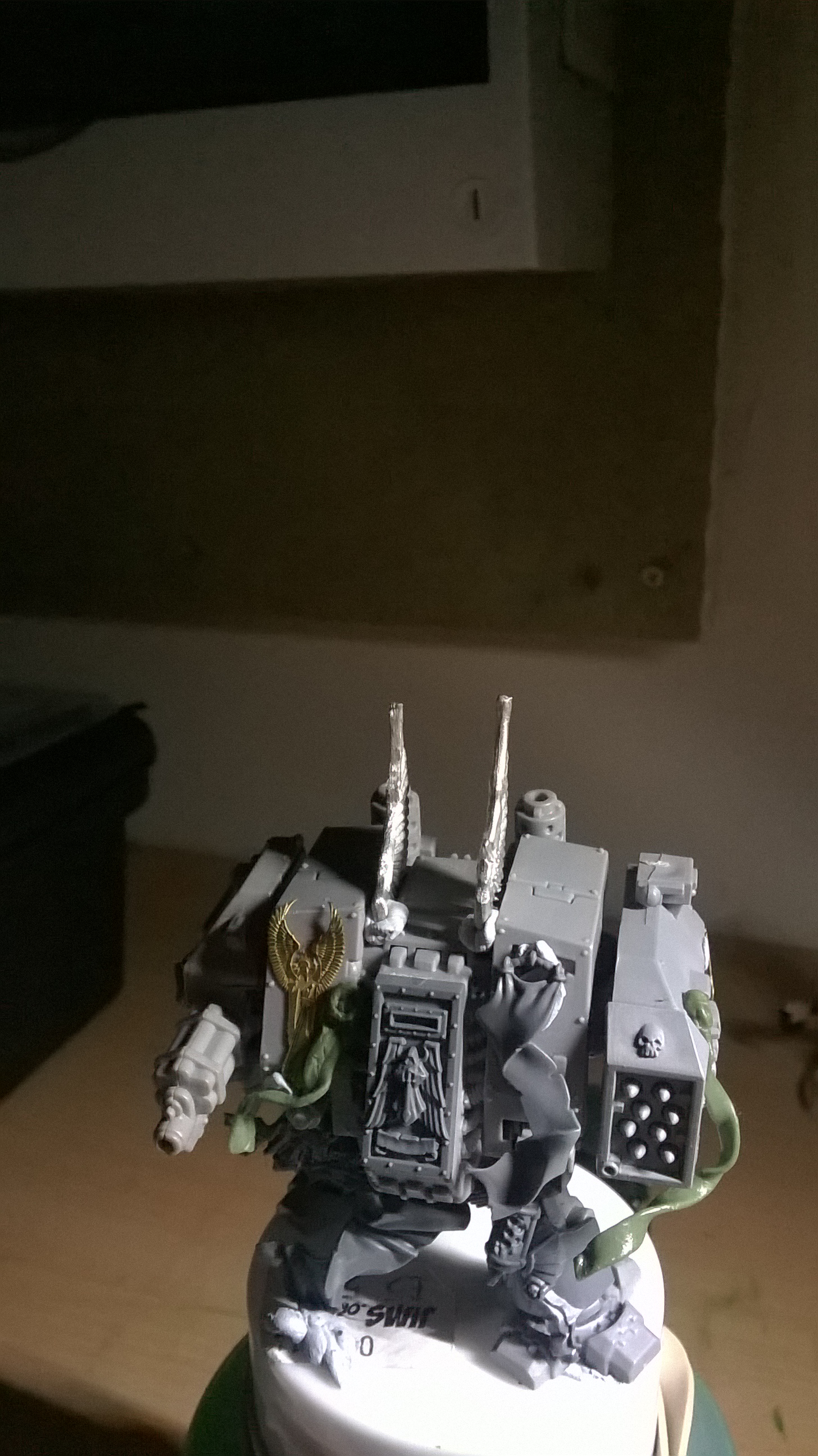 DA Icon on top of the sarcophagus is a good idea. I like it up there and it'll look cool on the final product. I would leave the swooping hawk wings off for two reasons. One: More fiddly bits to get knocked off of the mini during general use. Two: They look elven/alien, since they come from an Eldar model, and are not man-made looking.