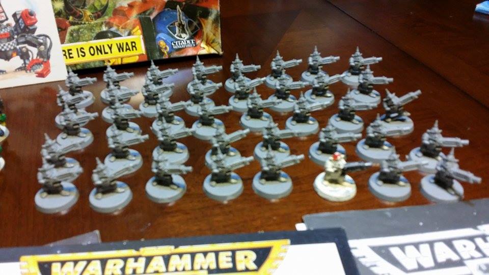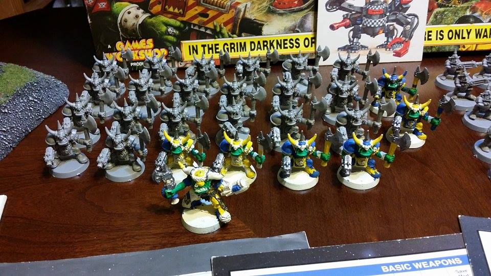 20 Orks (bolt pistol and axe),40 Gretchin (autogun),1 cardboard Ork dreadnought
