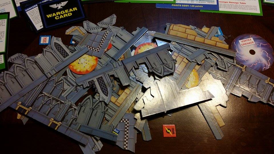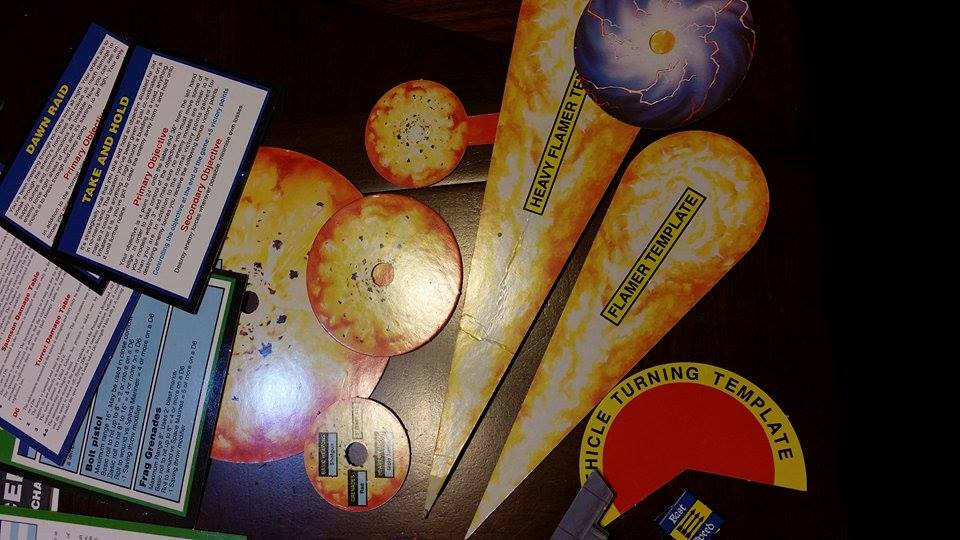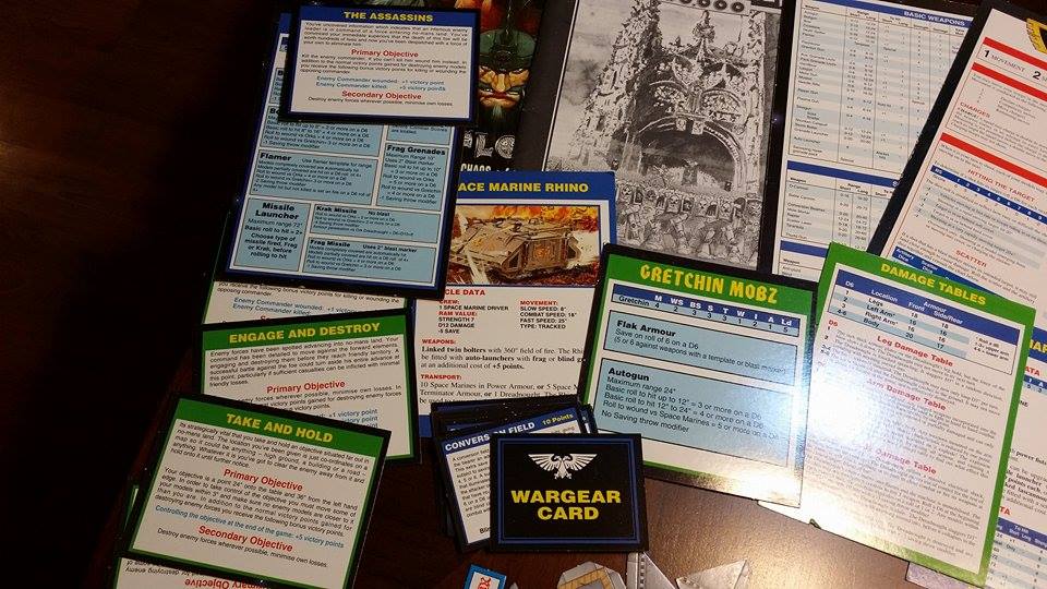 20 cardboard ruins,3 squad references cards (1 SpaceMarine, 1 Ork, 1 Gretchin)Victory point record chart,1 vehicle turning template,1 Thudgun template (made of four connected 1” blast templates ),1 blast template – 1”1 blast template – 1.5”1 blast template – 2”1 blast template – 3”2 vortex templates – 1.5”1 hand flamer template,1 flamer template,1 heavy flamer template,