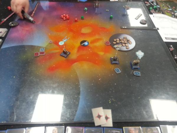. Khan finishes off the shields and deals two damage to the Soong. Picard fires back and strips Khans shields and does 2 damage. Sisko and the Fighters grab my last two moon tokens.