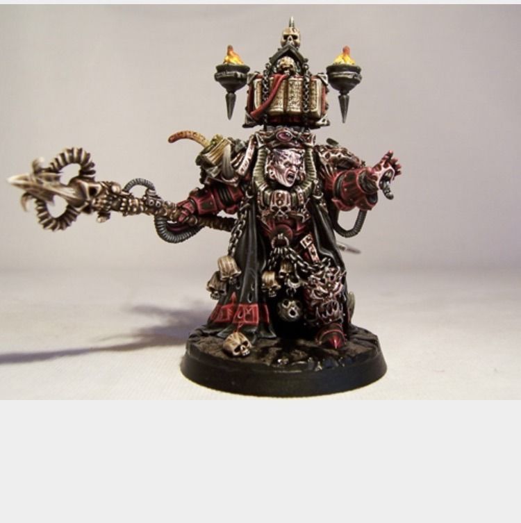Arms, book-banner, and the non-Dark Elf part of the staff are from the metal (and later on finecast) Terminator Librarian partially converted with both custom sculpted details and spiky chaos leftover parts