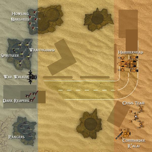 VPs for First Blood, Slay the Warlord and Linebreaker. I let him deploy second as well as giving him the first turn, since he wouldn't know which units did what anyway to counter my deployment. Both teams deployed defensively; Rangers and Banshees in a rubble crater and Dark reapers atop a ruined building, while the the War Walker sat in the open comfortable with it's shields and the wraithguard plus spiritseer hid out of sight; the Tau battlesuits and leader sat back with the Hammerhead positioned behind a low wall. We agreed that all cover would give a 5+ save for simplicity, and no Warlord Traits (mainly because R'alai's is stupid and confusing).