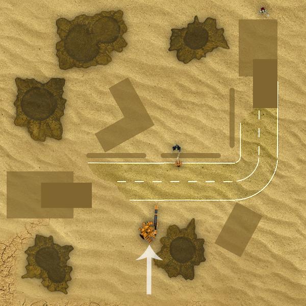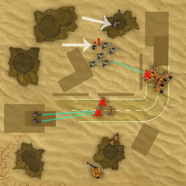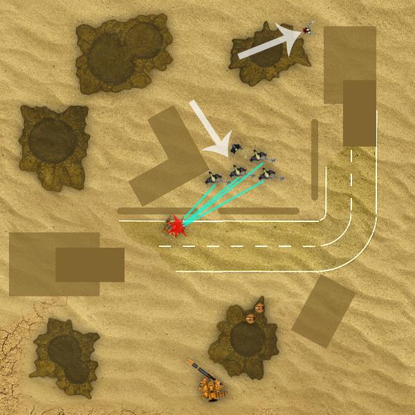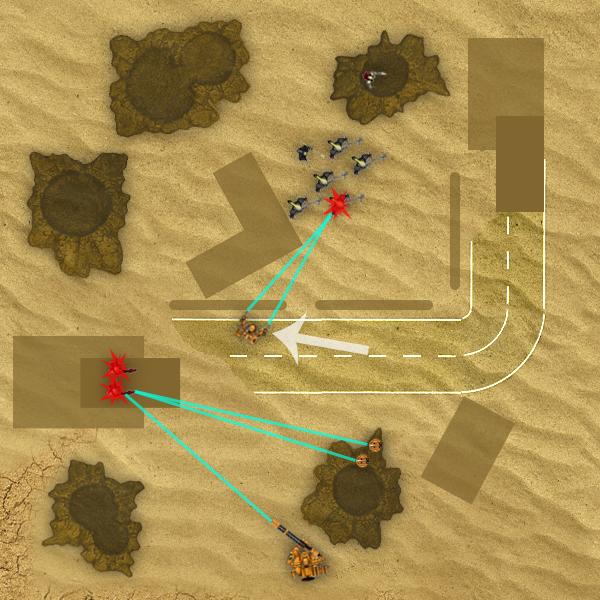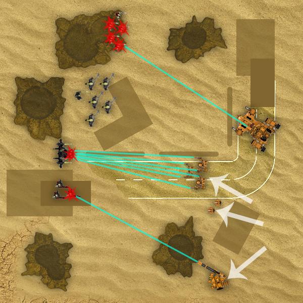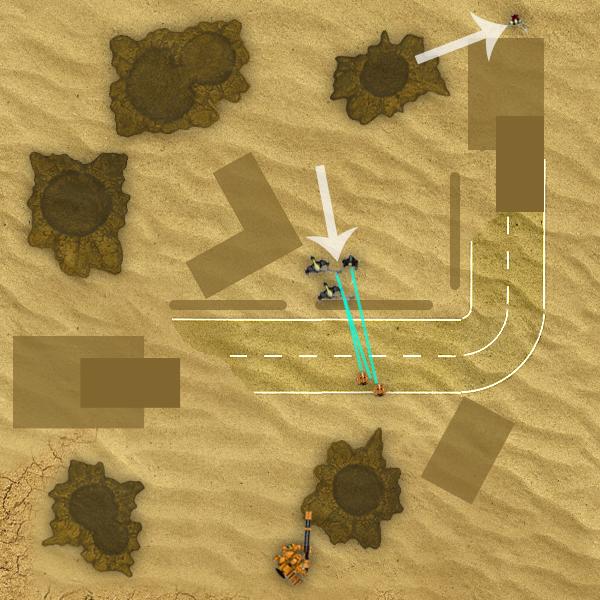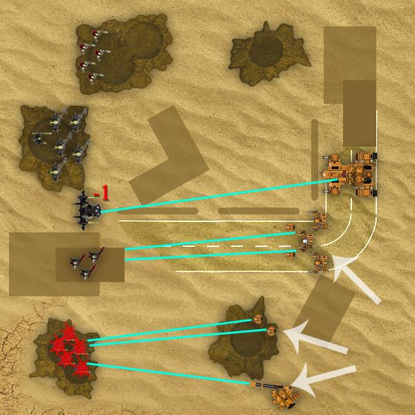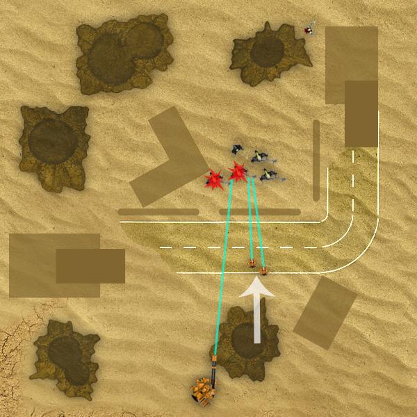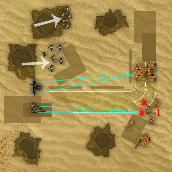 The Tau start by rushing forward into range with their plasma rifles and out in the open centre of the battlefield. R'alai detaches from his marker drones which land both their markers on the Rangers. R'alai follows up with a devastating 2 large blasts at S4 AP4 rending, and by using the markerlights to ignore the cover save manage to eliminate 4 of the 5 Rangers. Only 1 of the crisis suits is in range to shoot, and fires 2 plasma shots at the Dark Reapers, both of which hit the ruin. Finally, the Hammerhead elects to shoot at the War Walker; S10 means an instant penetrating hit, but the walker's shield absorbs the shot. The smart missiles fire an accompanying volley but only take it down by 1 hull point. The shooting phase ends with the final living Ranger failing his leadership test and fleeing straight off the battlefield with the cry of "Where'd my squad go? Screw this!". The Tau claim First Blood and end their turn by jumping back behind cover, although a dud roll means the crisis suits aren't able to hide completely.