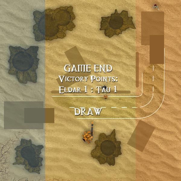 Once again the seer casts Drain and managed to whiff his attack, as does the drone unsurprisingly. All that remains is to see whether or not the game continues for a final turn... it does not! Before R'alai has a chance to reach the assault and fight warlord-on-warlord for the game-winning victory point the battle ceases. Tau claim one point for First Blood while Eldar claim a point for Linebreaker - both warlords survive and are the last men standing!