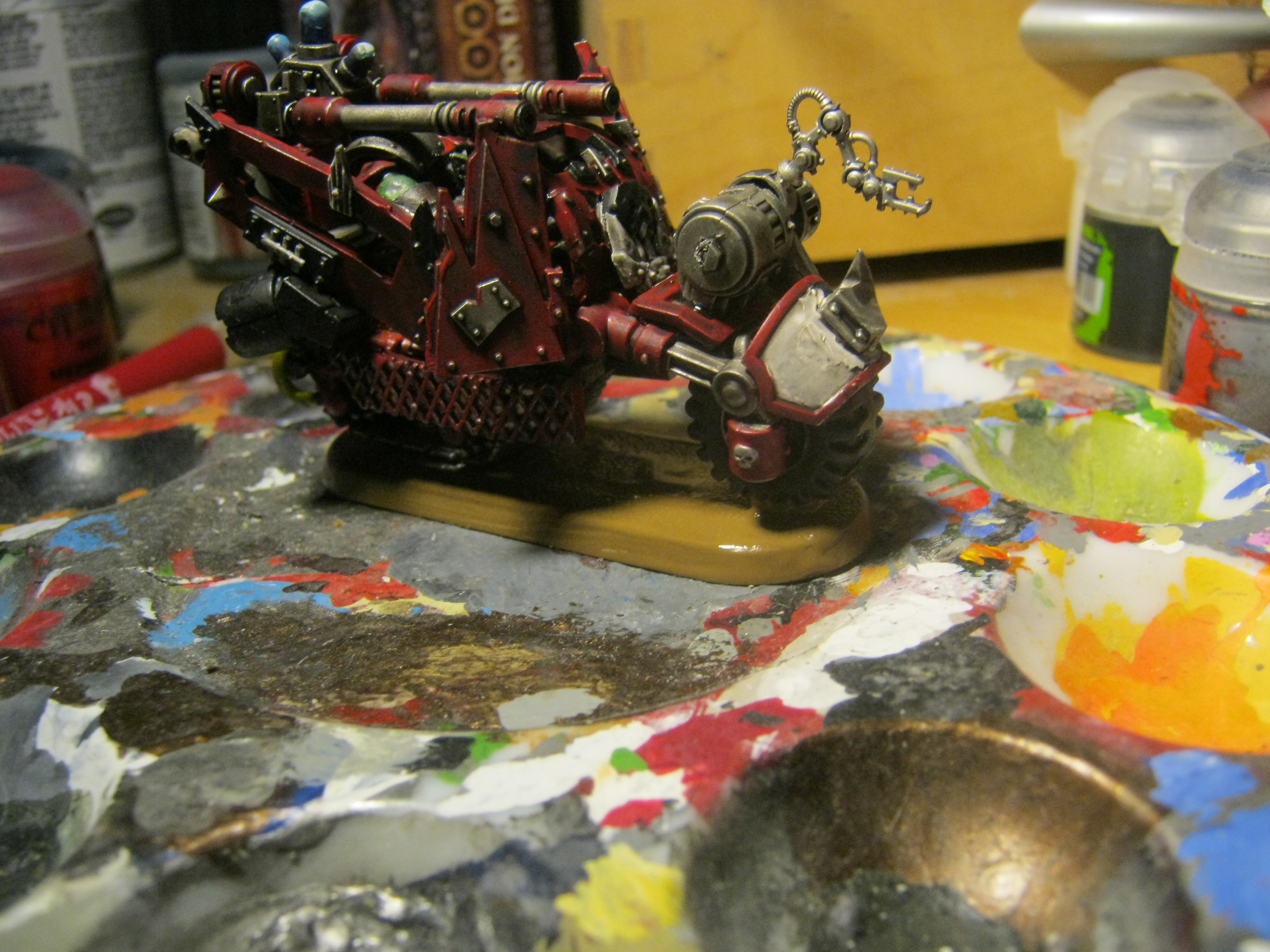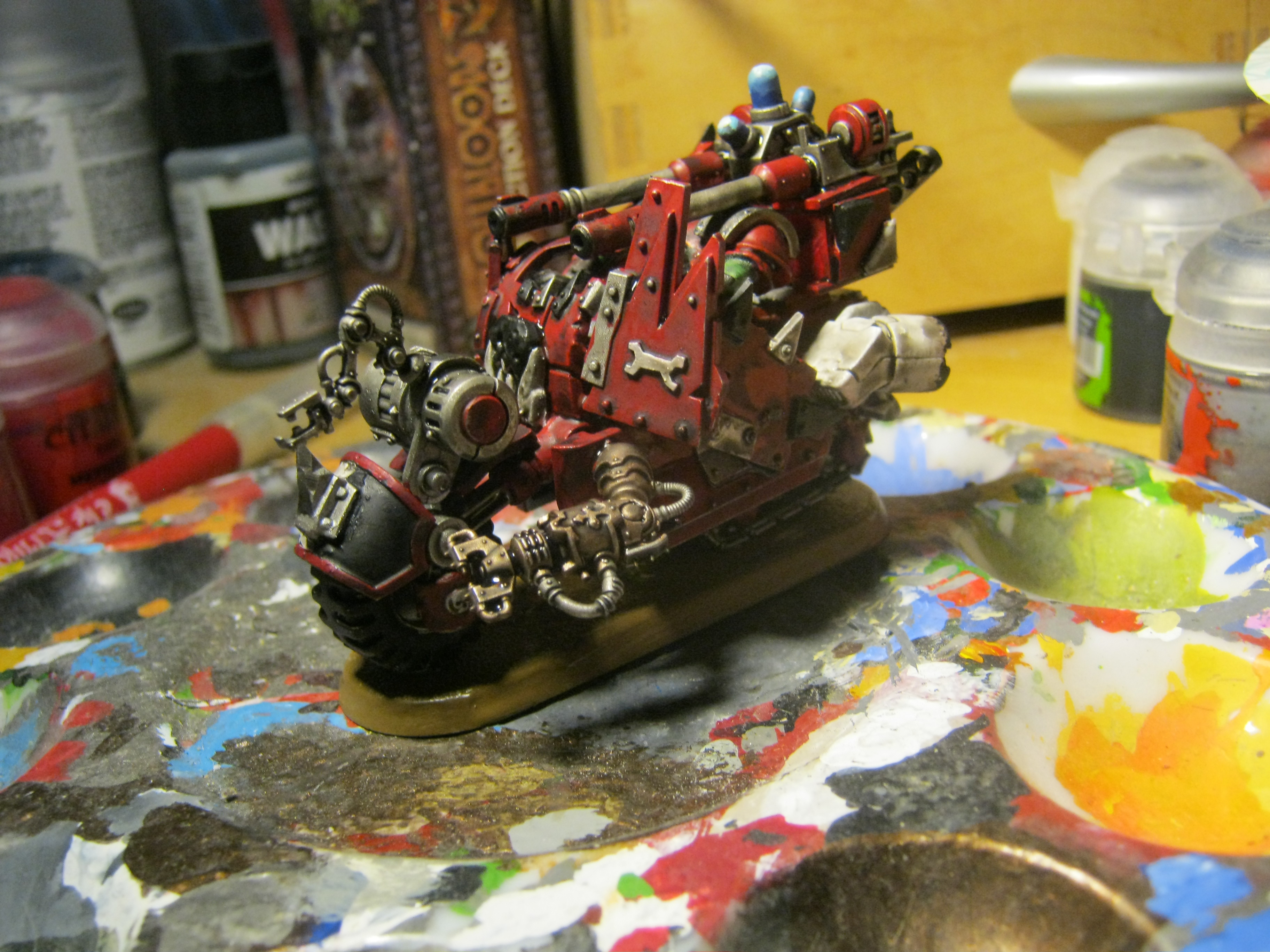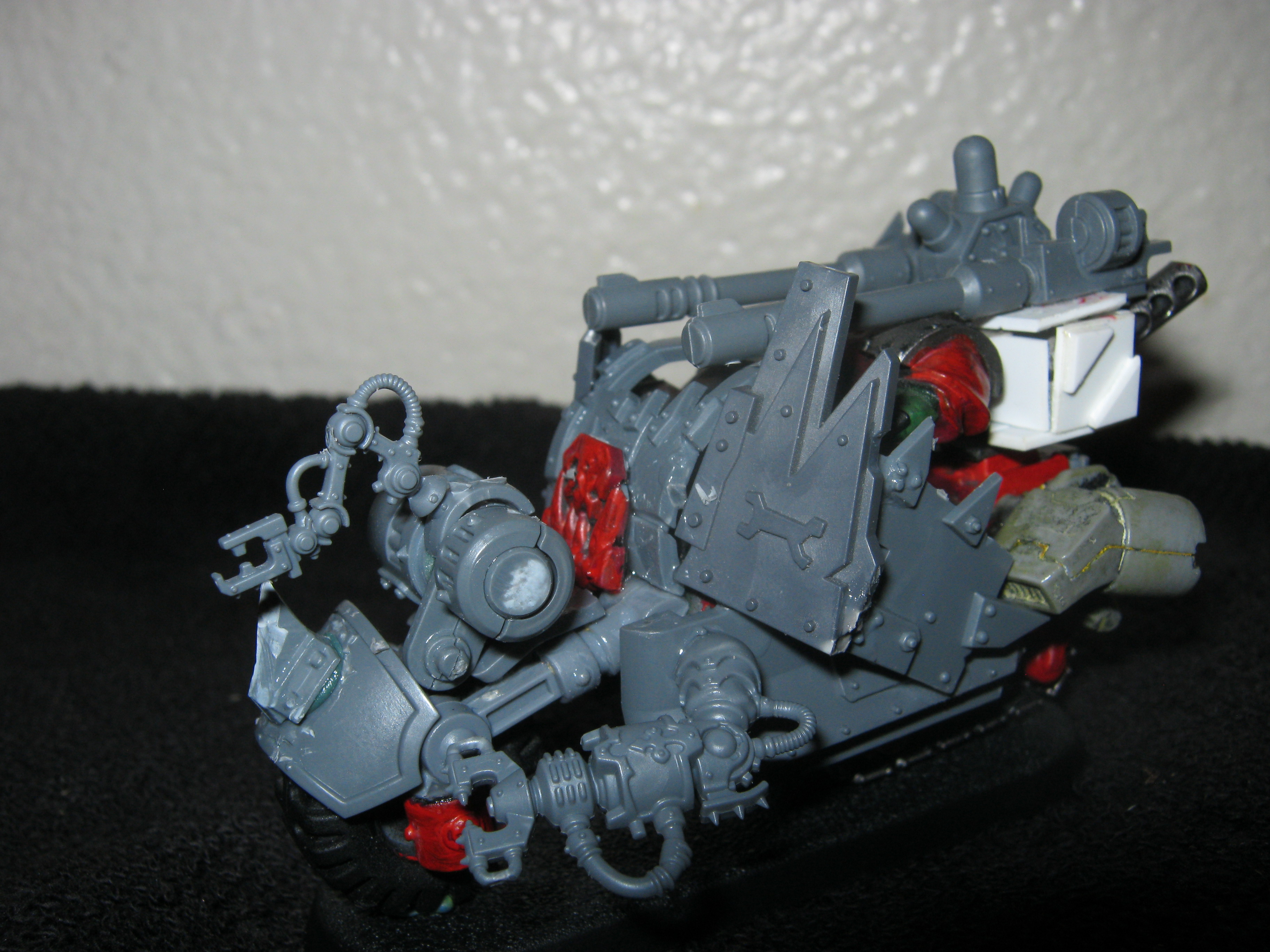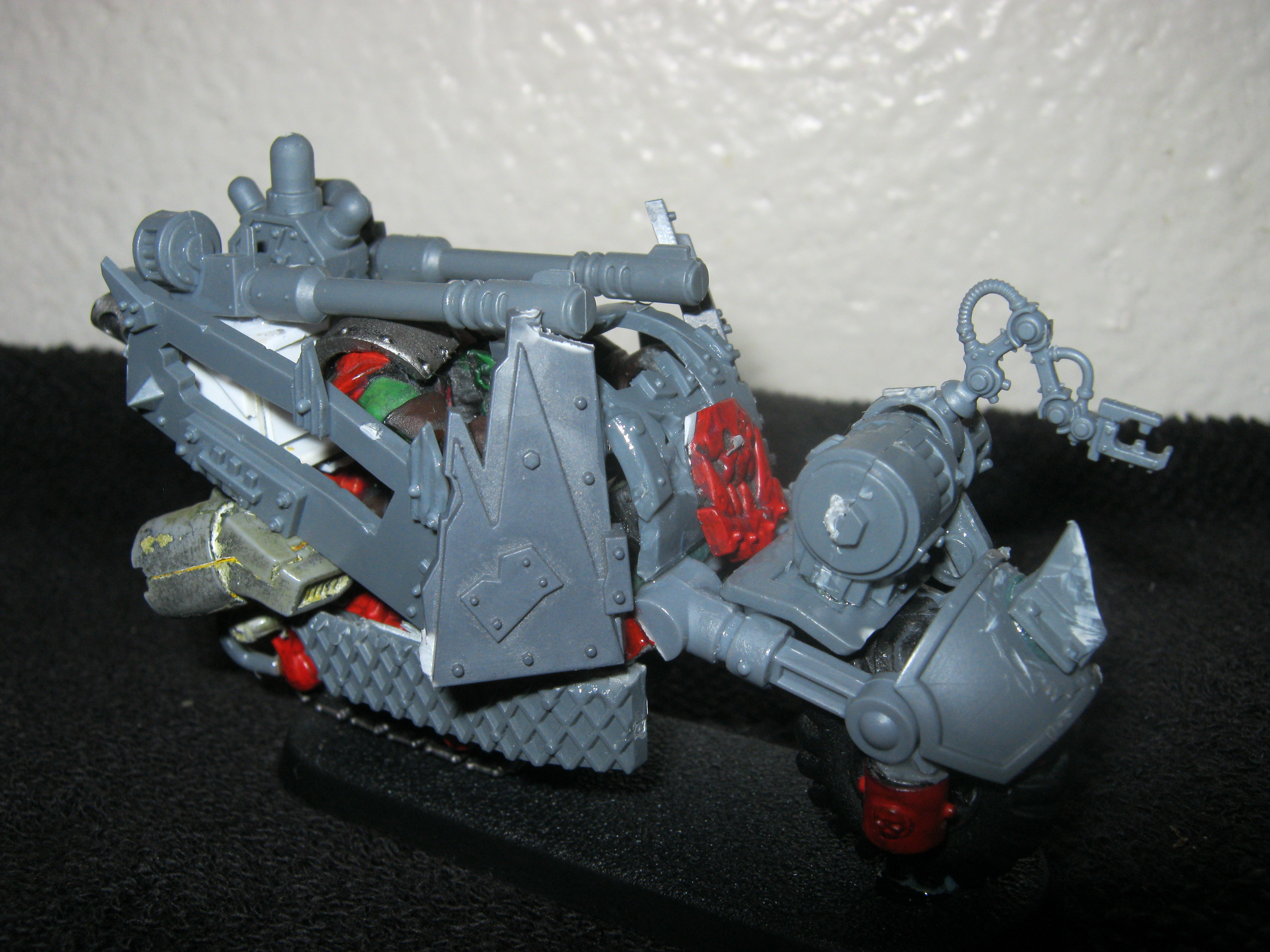 The back is a track, its actually one of the gorkamorka bikes. I have a bunch I have been meaning to modernize to add to my bikes. I just dident have a mek on a bike yet so started with him. He has the repair claws, and a force field generator on the back.